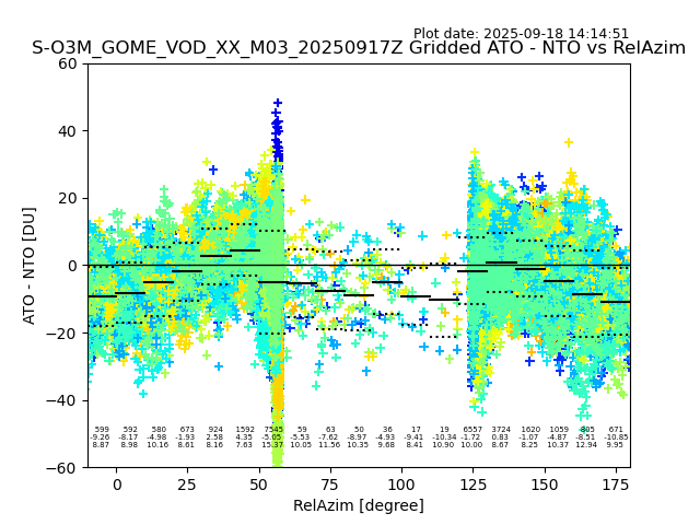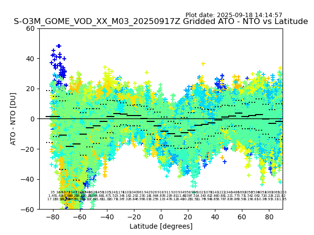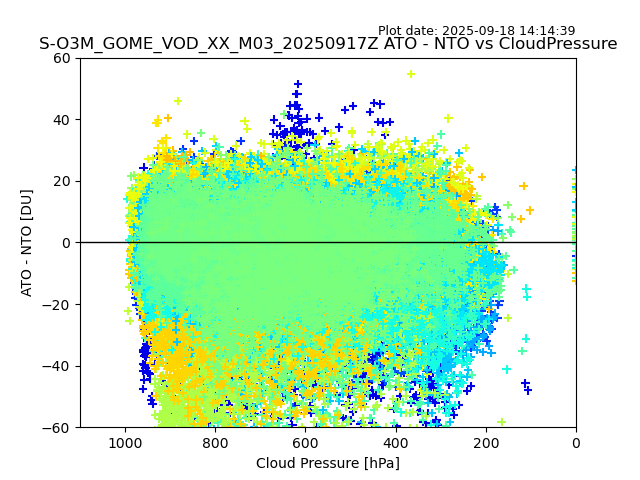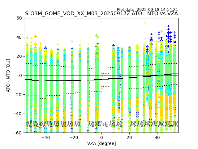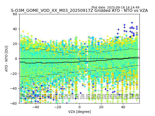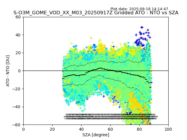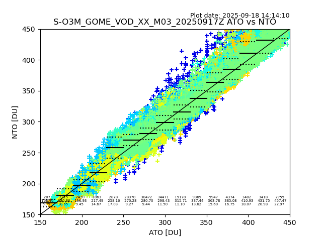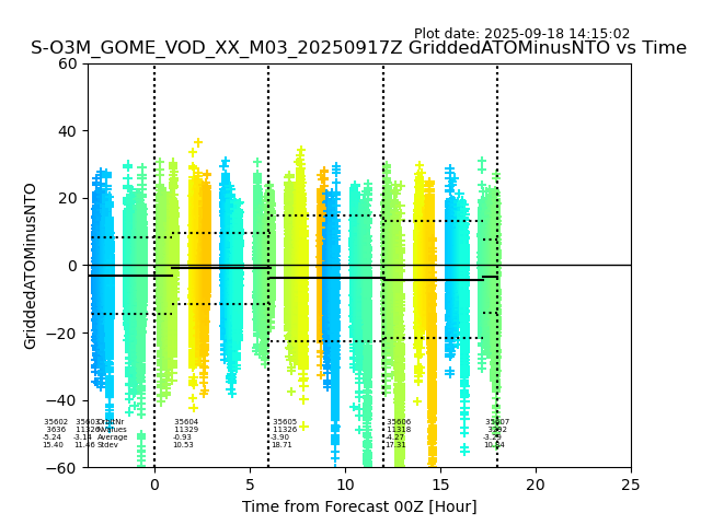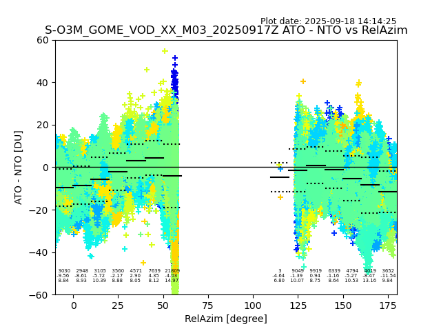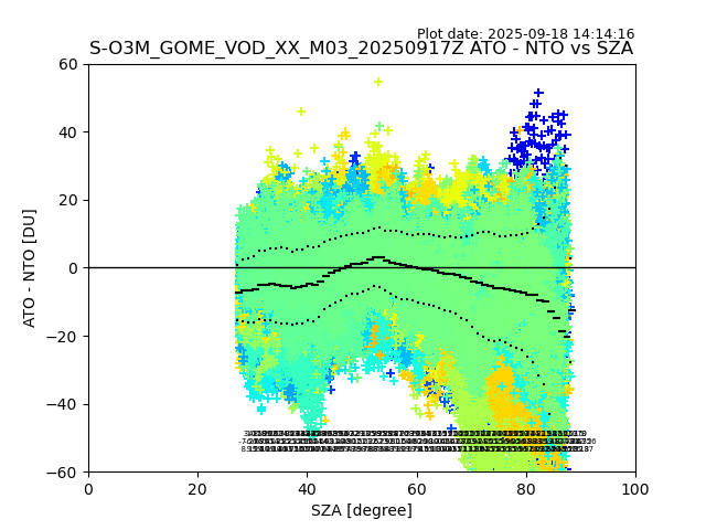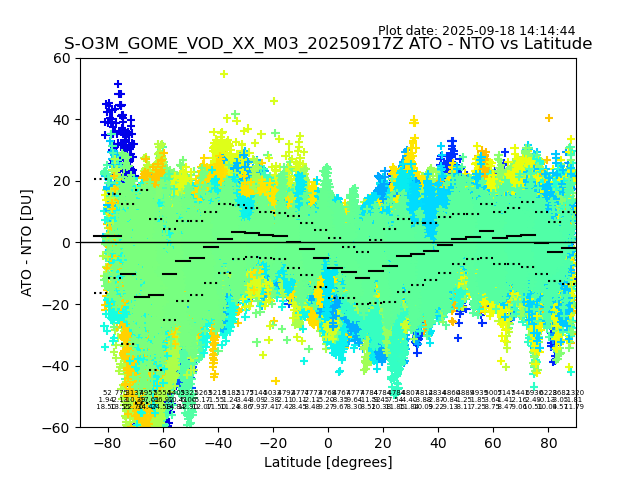 The date given in the title of the plot indicates the T=0 day for which the NTO/O3 data is compared. Example: S-O3M_GOME_VOD__M02_20110117Z indicates that the plot is for data from 2011-01-17 00:00 up NTO/O3 files starting at 2011-01-17 23:59 is used.