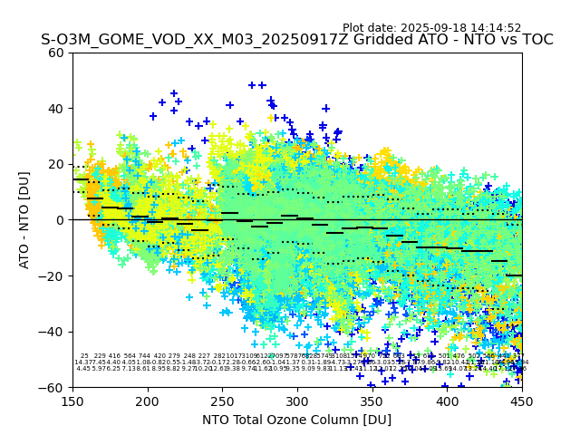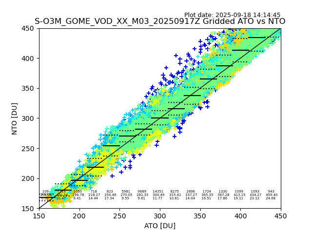 Using these forecast fields, the actual measured NTO/O3 from T=0 to T+24h can be compared. The comparison can be between each individual NTO/O3 retrieval and the ATO value in the associated grid box, or between 'pre-gridded' NTO/O3 values and the ATO value. Both these comparisons are given.