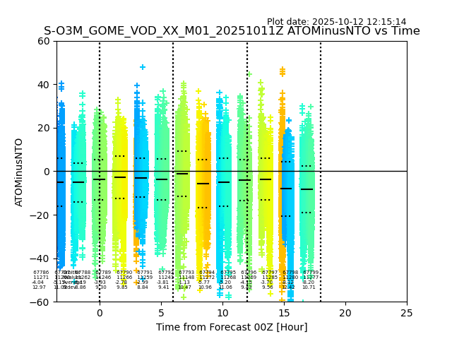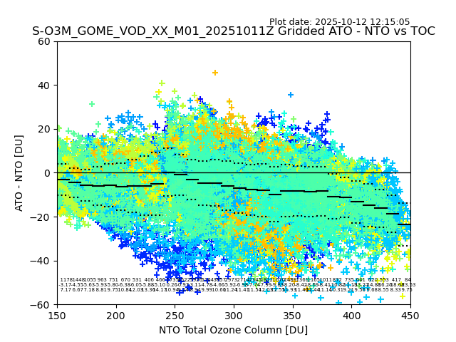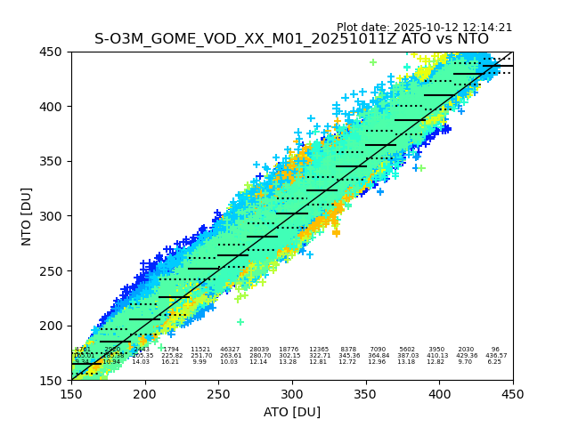 Using these forecast fields, the actual measured NTO/O3 from T=0 to T+24h can be compared. The comparison can be between each individual NTO/O3 retrieval and the ATO value in the associated grid box, or between 'pre-gridded' NTO/O3 values and the ATO value. Both these comparisons are given.