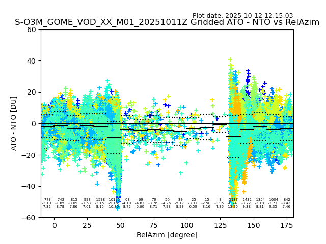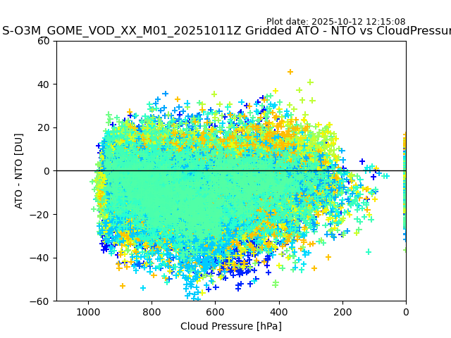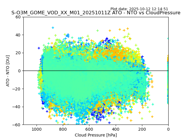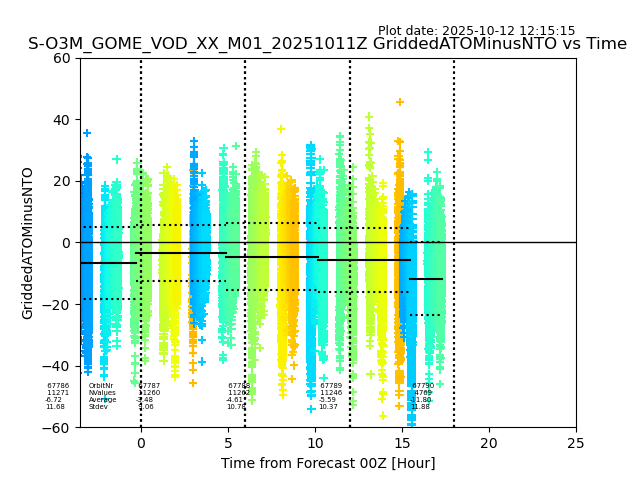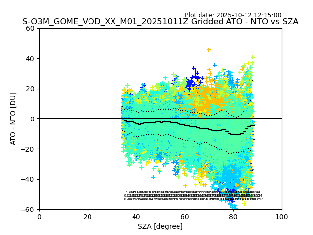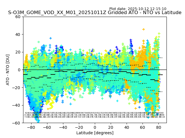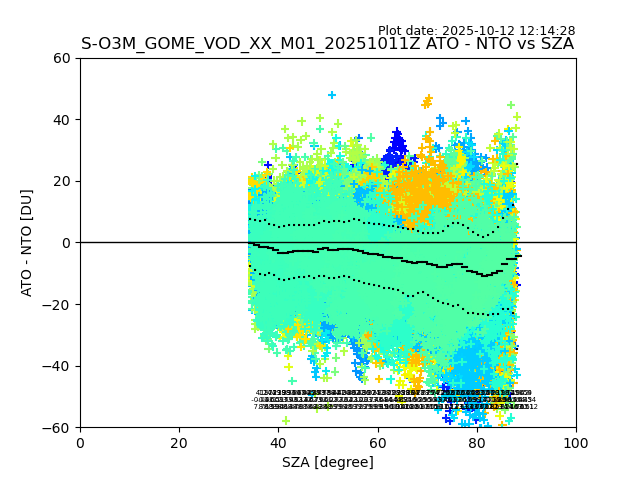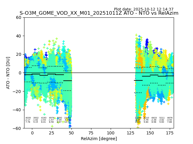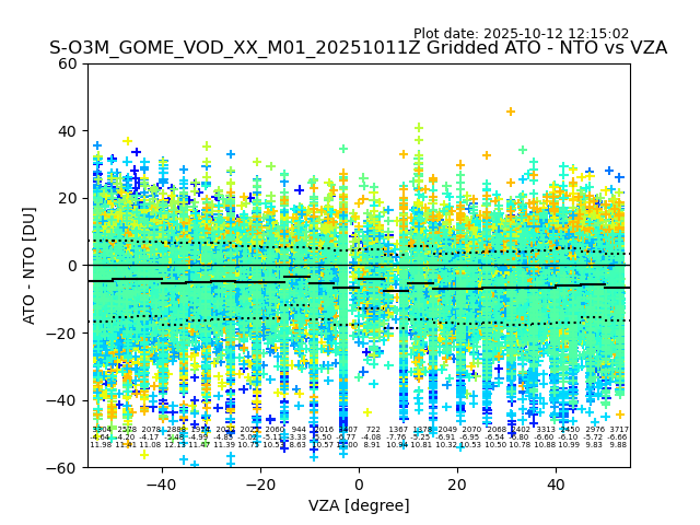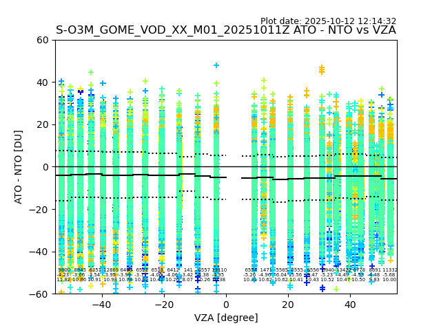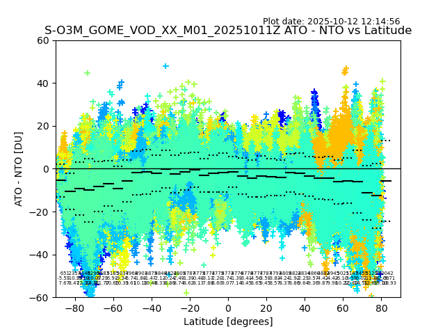 The date given in the title of the plot indicates the T=0 day for which the NTO/O3 data is compared. Example: S-O3M_GOME_VOD__M02_20110117Z indicates that the plot is for data from 2011-01-17 00:00 up NTO/O3 files starting at 2011-01-17 23:59 is used.