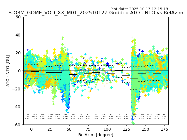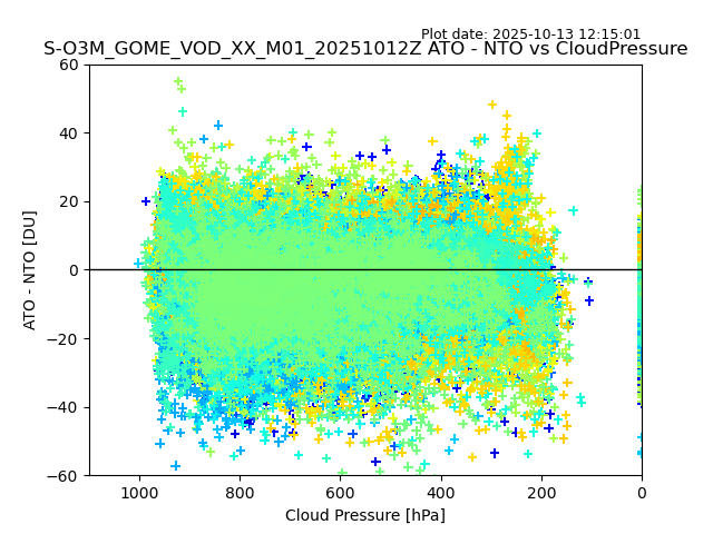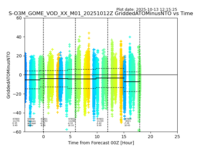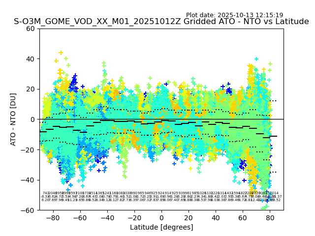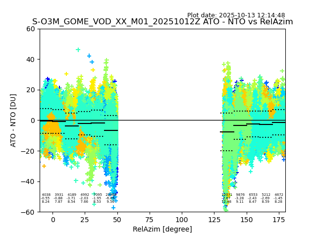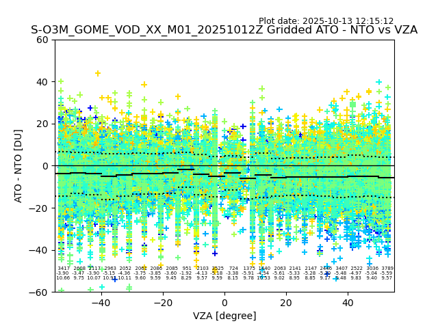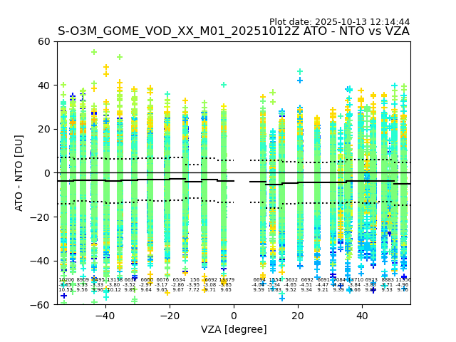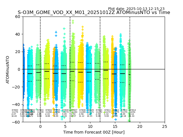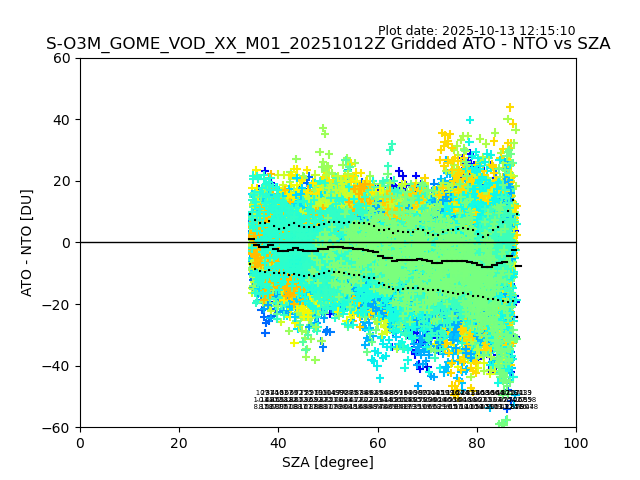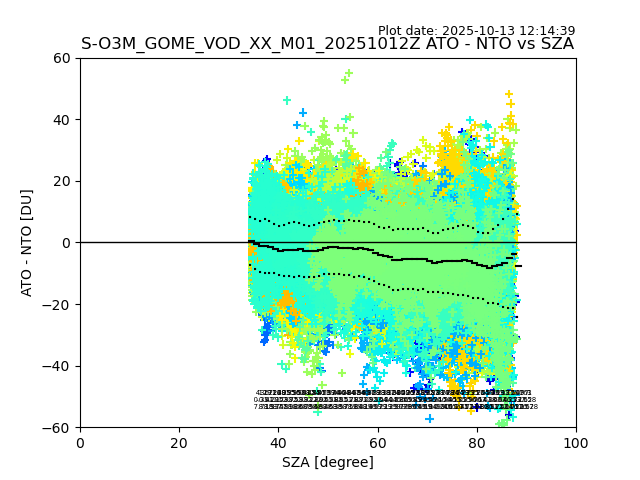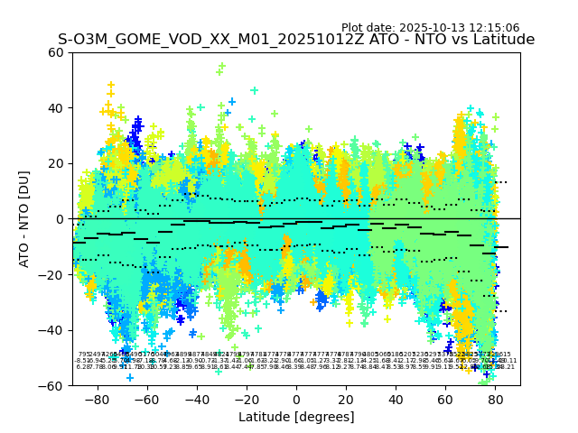 The date given in the title of the plot indicates the T=0 day for which the NTO/O3 data is compared. Example: S-O3M_GOME_VOD__M02_20110117Z indicates that the plot is for data from 2011-01-17 00:00 up NTO/O3 files starting at 2011-01-17 23:59 is used.