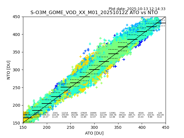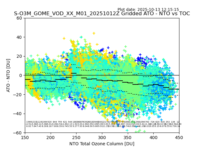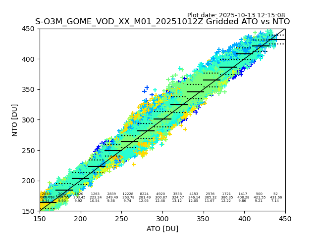 Using these forecast fields, the actual measured NTO/O3 from T=0 to T+24h can be compared. The comparison can be between each individual NTO/O3 retrieval and the ATO value in the associated grid box, or between 'pre-gridded' NTO/O3 values and the ATO value. Both these comparisons are given.