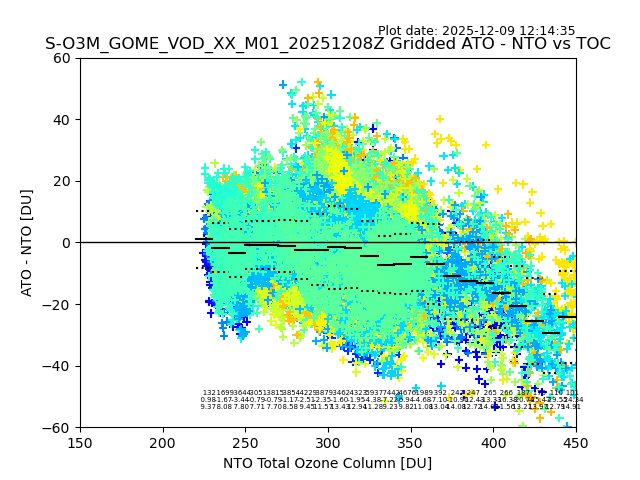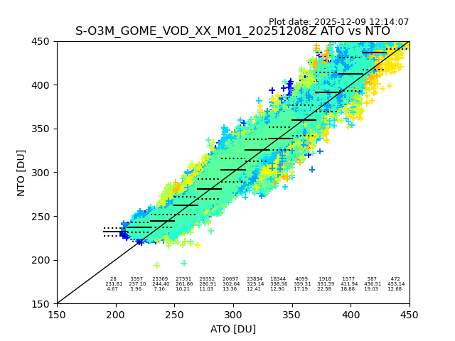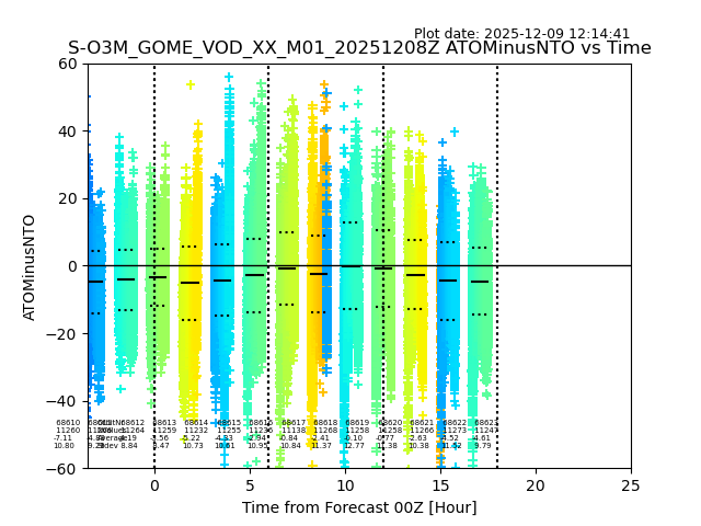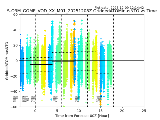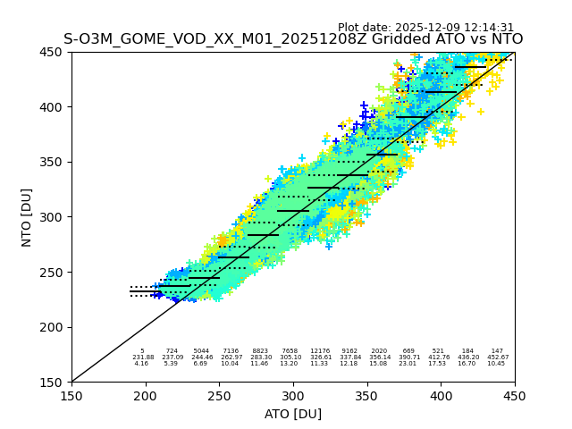 Using these forecast fields, the actual measured NTO/O3 from T=0 to T+24h can be compared. The comparison can be between each individual NTO/O3 retrieval and the ATO value in the associated grid box, or between 'pre-gridded' NTO/O3 values and the ATO value. Both these comparisons are given.