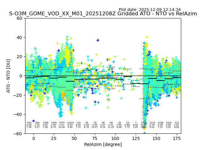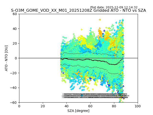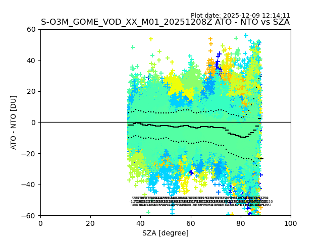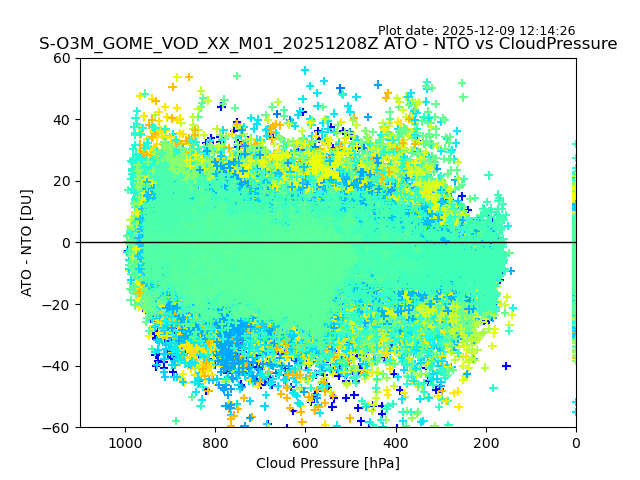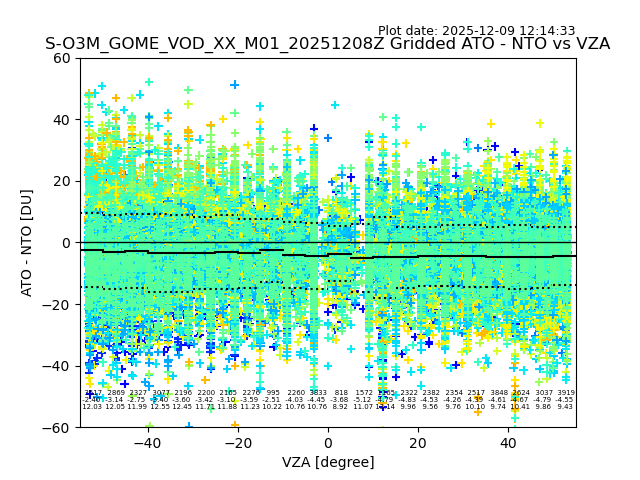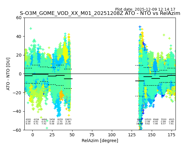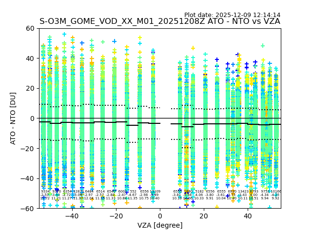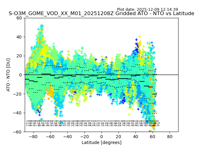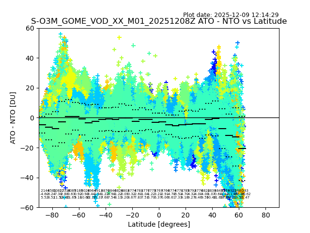 The date given in the title of the plot indicates the T=0 day for which the NTO/O3 data is compared. Example: S-O3M_GOME_VOD__M02_20110117Z indicates that the plot is for data from 2011-01-17 00:00 up NTO/O3 files starting at 2011-01-17 23:59 is used.