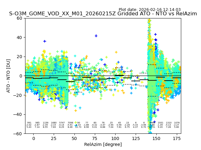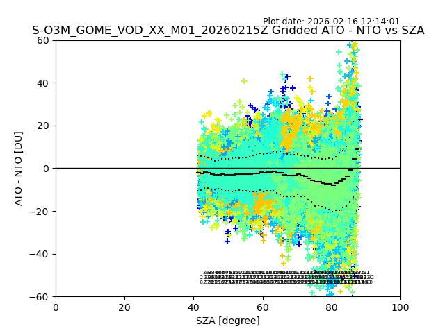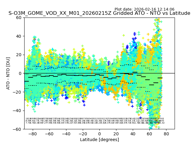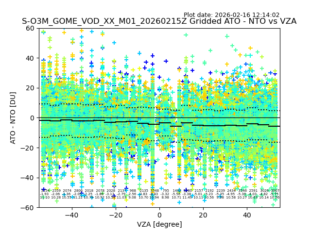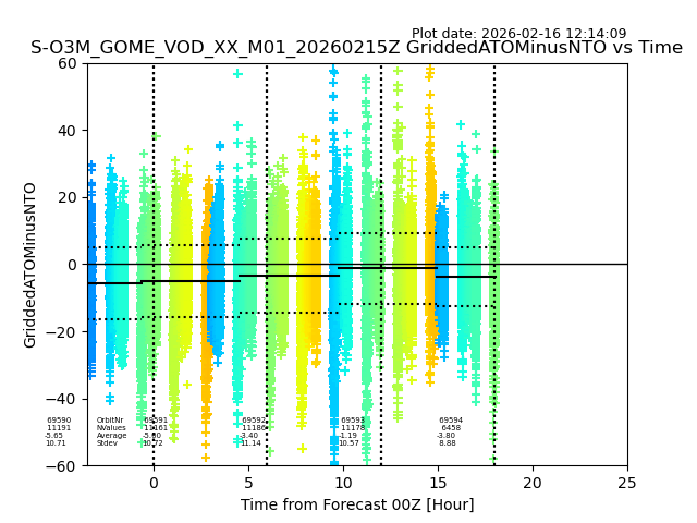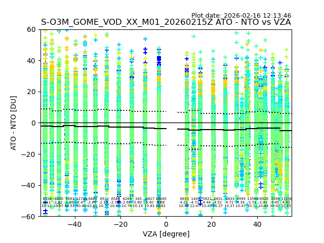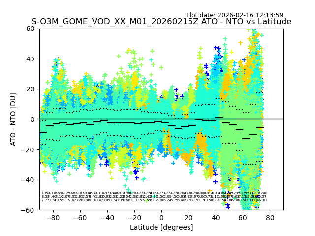 The date given in the title of the plot indicates the T=0 day for which the NTO/O3 data is compared. Example: S-O3M_GOME_VOD__M02_20110117Z indicates that the plot is for data from 2011-01-17 00:00 up NTO/O3 files starting at 2011-01-17 23:59 is used.