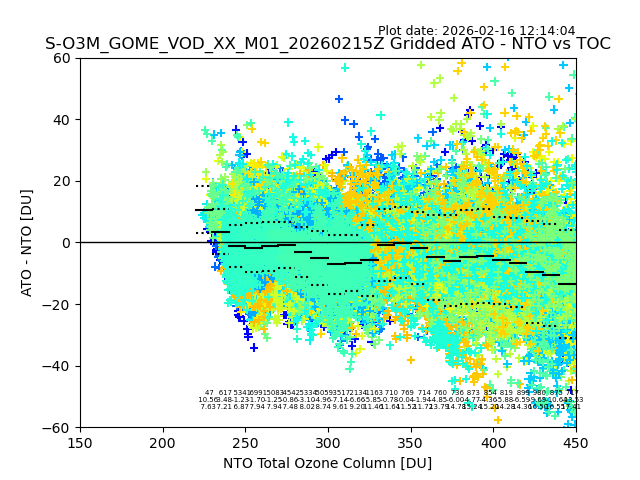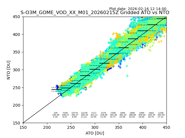 Using these forecast fields, the actual measured NTO/O3 from T=0 to T+24h can be compared. The comparison can be between each individual NTO/O3 retrieval and the ATO value in the associated grid box, or between 'pre-gridded' NTO/O3 values and the ATO value. Both these comparisons are given.