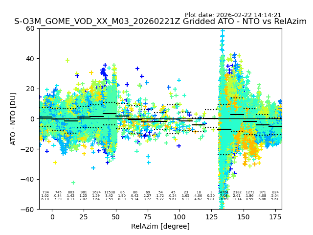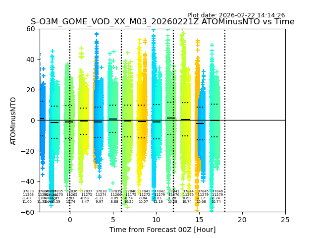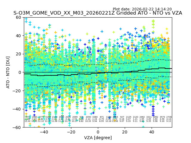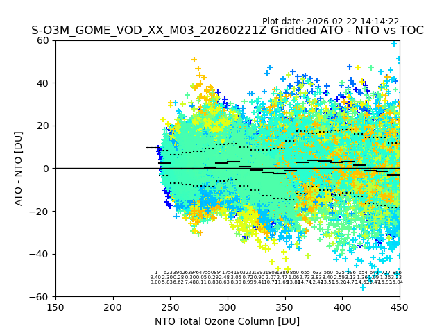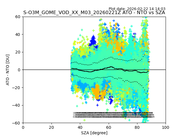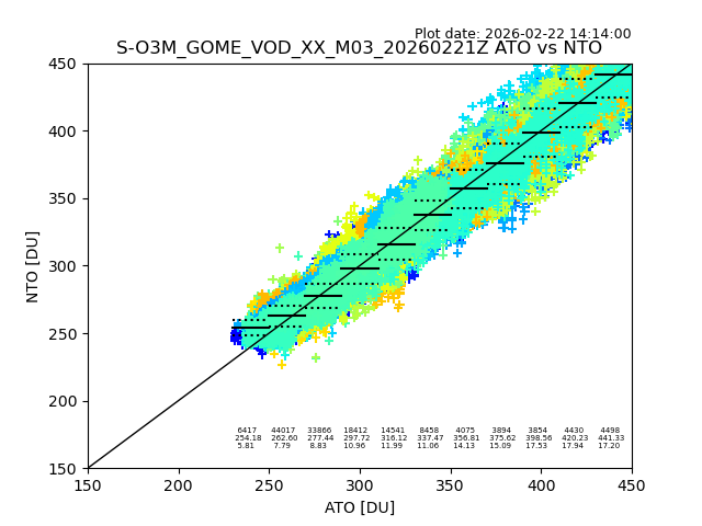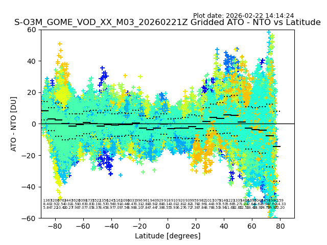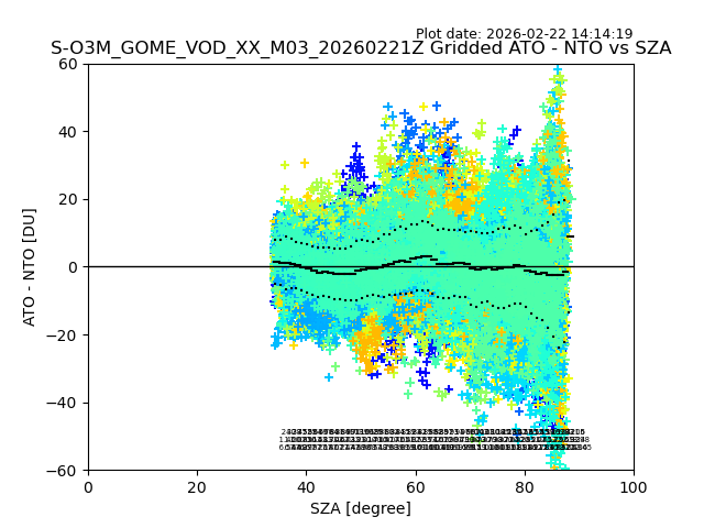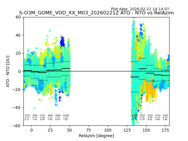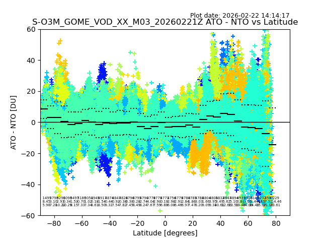 The date given in the title of the plot indicates the T=0 day for which the NTO/O3 data is compared. Example: S-O3M_GOME_VOD__M02_20110117Z indicates that the plot is for data from 2011-01-17 00:00 up NTO/O3 files starting at 2011-01-17 23:59 is used.