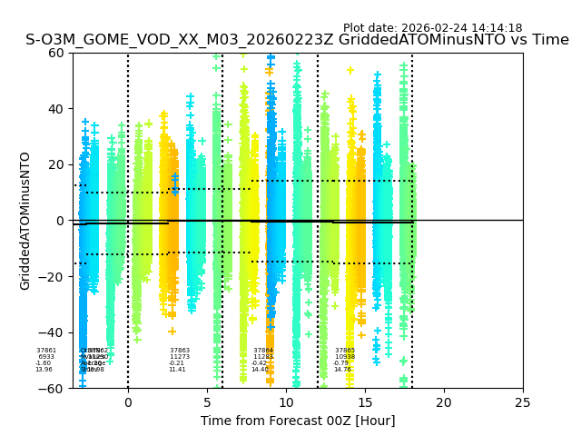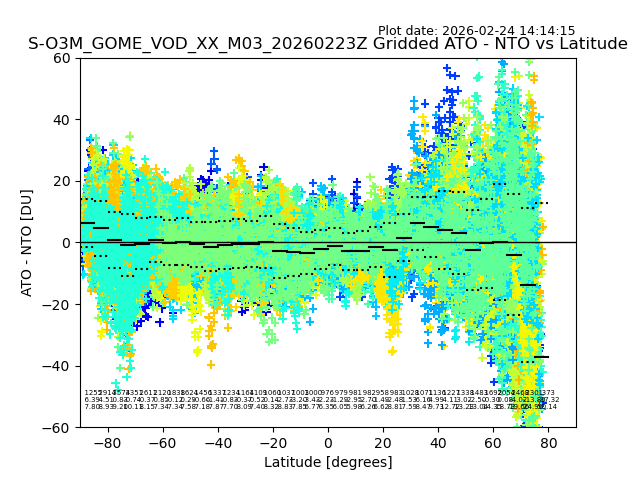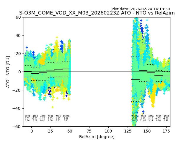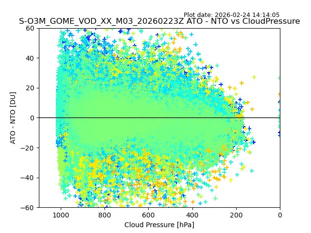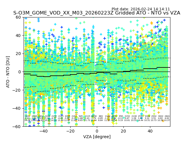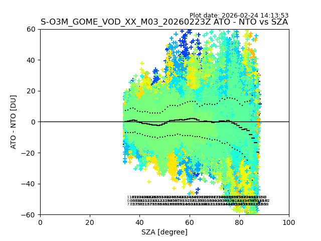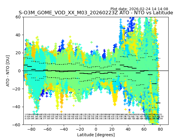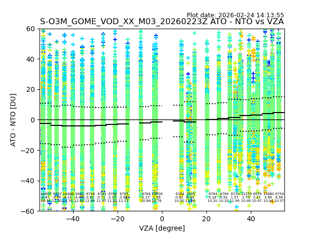 The date given in the title of the plot indicates the T=0 day for which the NTO/O3 data is compared. Example: S-O3M_GOME_VOD__M02_20110117Z indicates that the plot is for data from 2011-01-17 00:00 up NTO/O3 files starting at 2011-01-17 23:59 is used.