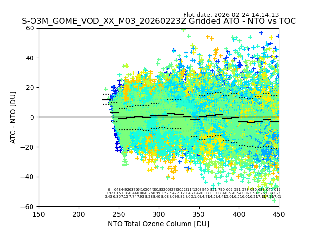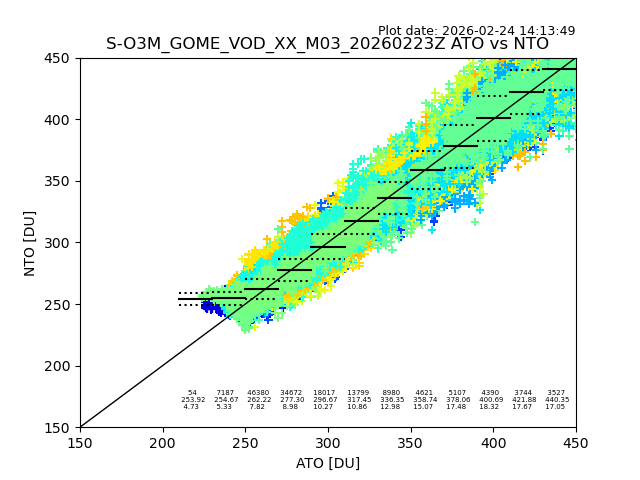 Using these forecast fields, the actual measured NTO/O3 from T=0 to T+24h can be compared. The comparison can be between each individual NTO/O3 retrieval and the ATO value in the associated grid box, or between 'pre-gridded' NTO/O3 values and the ATO value. Both these comparisons are given.