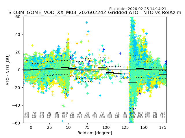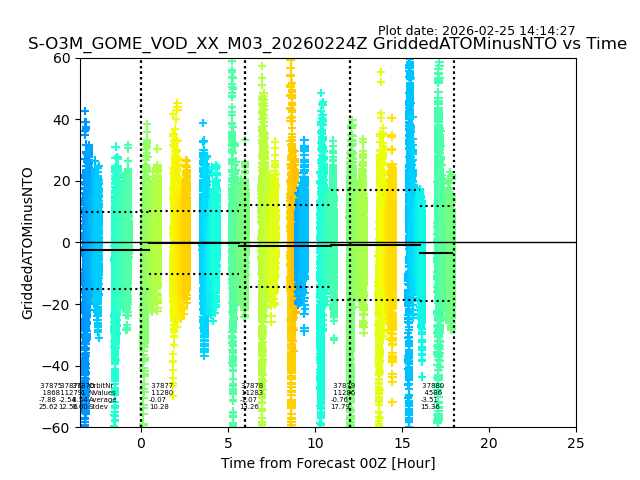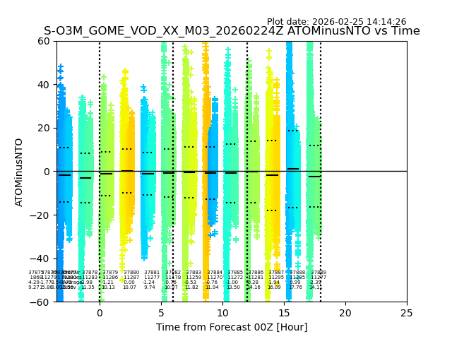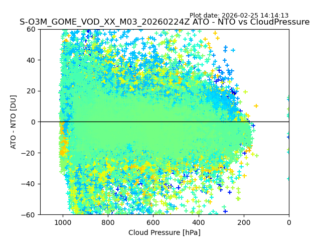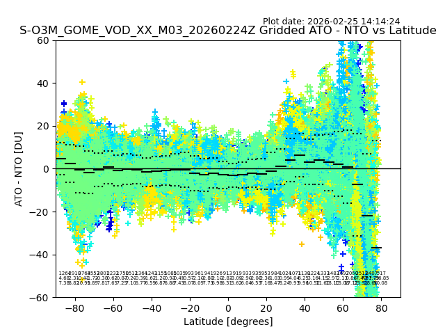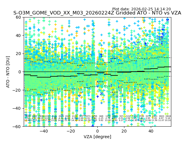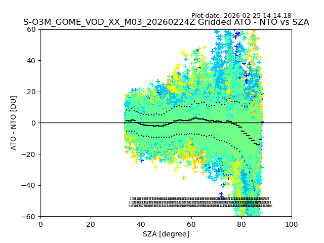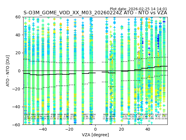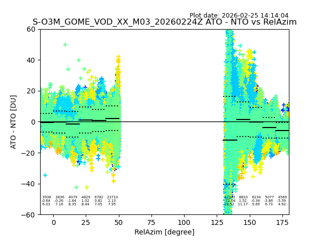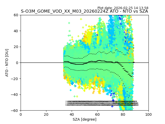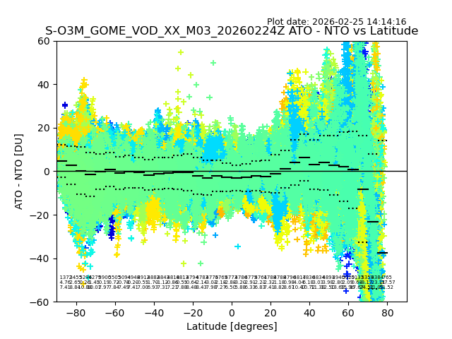 The date given in the title of the plot indicates the T=0 day for which the NTO/O3 data is compared. Example: S-O3M_GOME_VOD__M02_20110117Z indicates that the plot is for data from 2011-01-17 00:00 up NTO/O3 files starting at 2011-01-17 23:59 is used.
