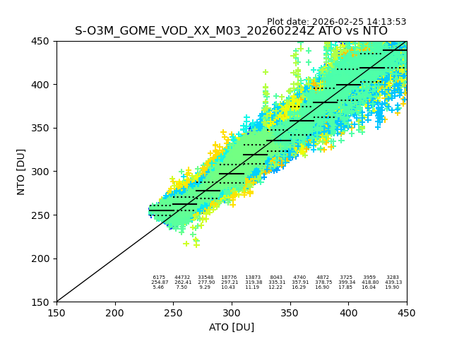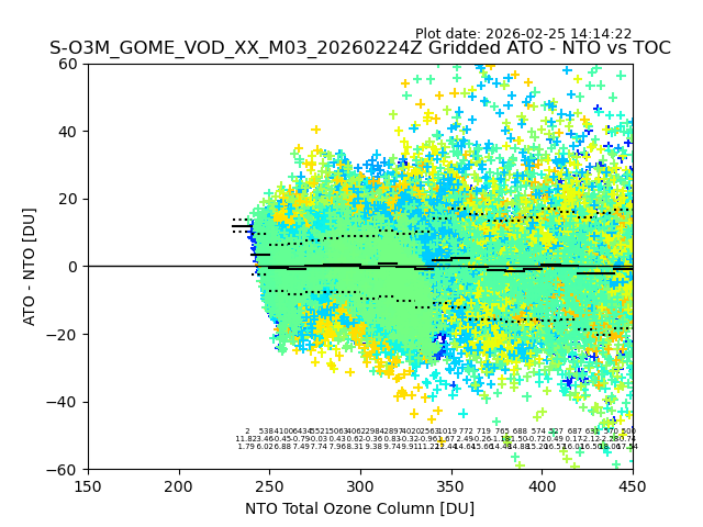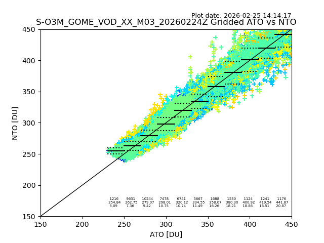 Using these forecast fields, the actual measured NTO/O3 from T=0 to T+24h can be compared. The comparison can be between each individual NTO/O3 retrieval and the ATO value in the associated grid box, or between 'pre-gridded' NTO/O3 values and the ATO value. Both these comparisons are given.