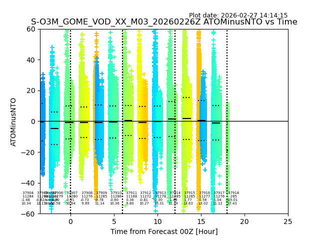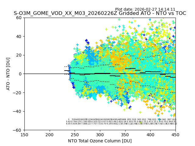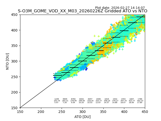 Using these forecast fields, the actual measured NTO/O3 from T=0 to T+24h can be compared. The comparison can be between each individual NTO/O3 retrieval and the ATO value in the associated grid box, or between 'pre-gridded' NTO/O3 values and the ATO value. Both these comparisons are given.