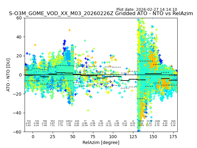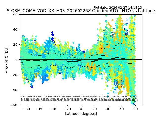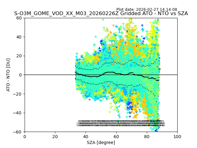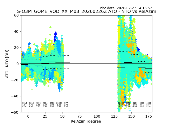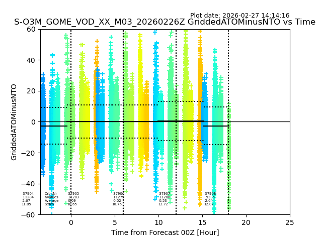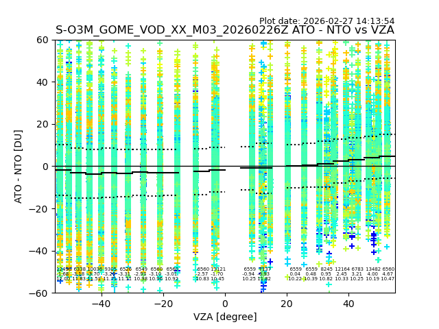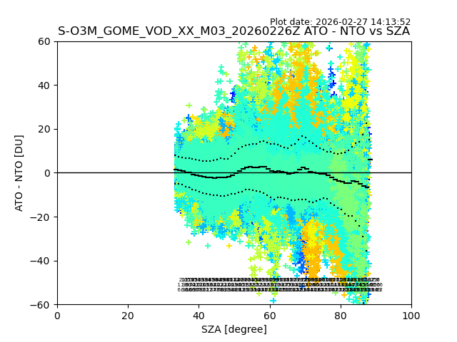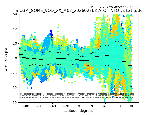 The date given in the title of the plot indicates the T=0 day for which the NTO/O3 data is compared. Example: S-O3M_GOME_VOD__M02_20110117Z indicates that the plot is for data from 2011-01-17 00:00 up NTO/O3 files starting at 2011-01-17 23:59 is used.