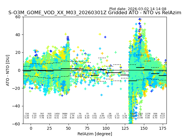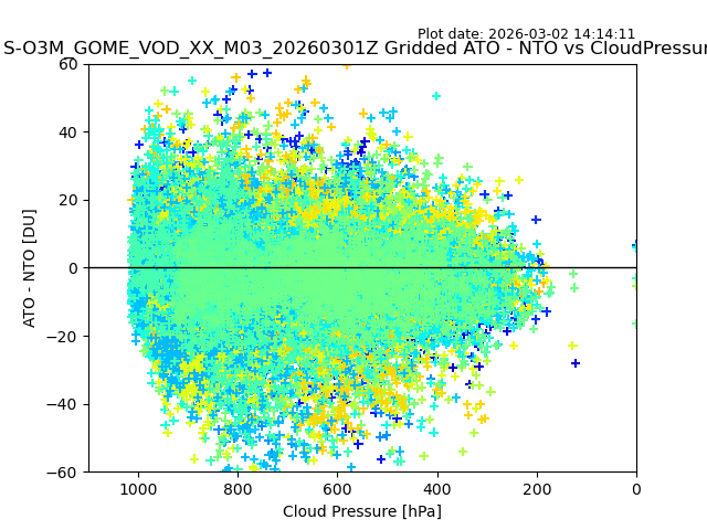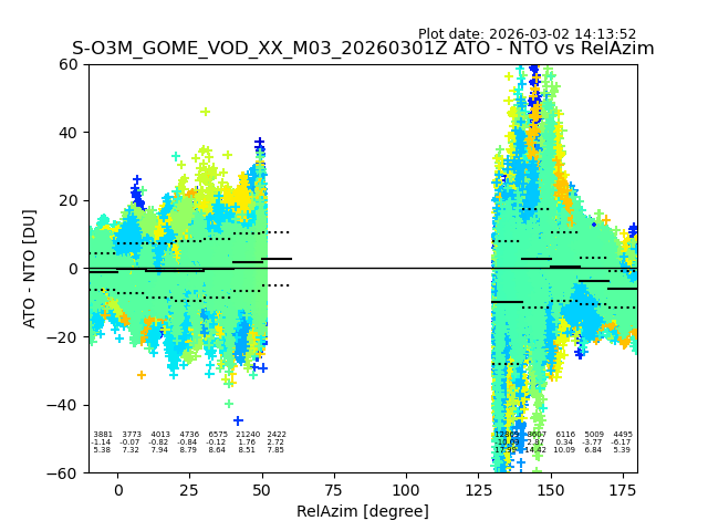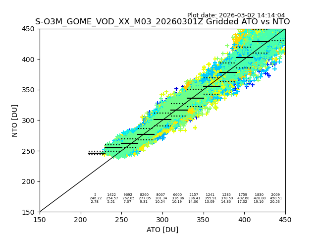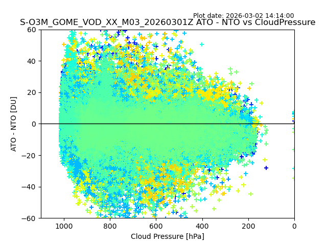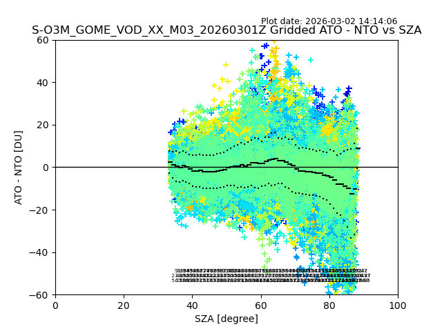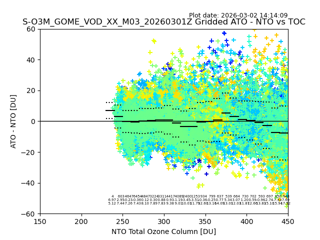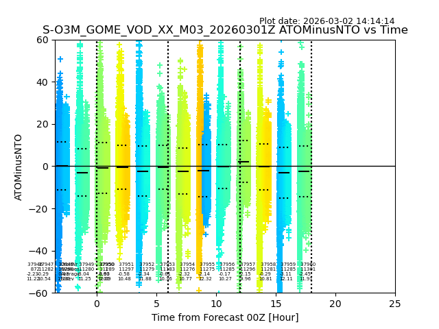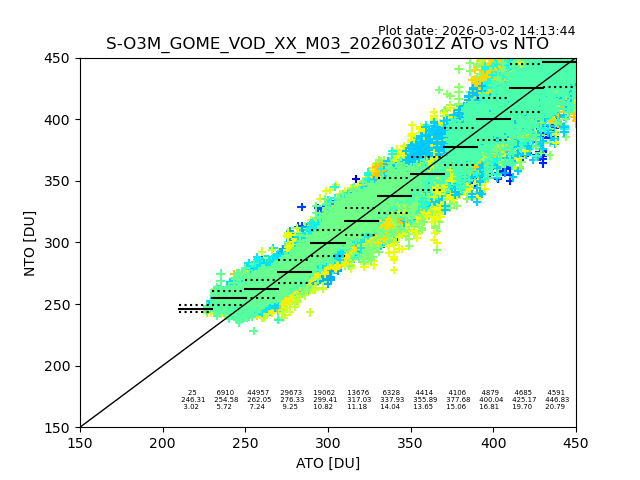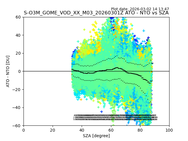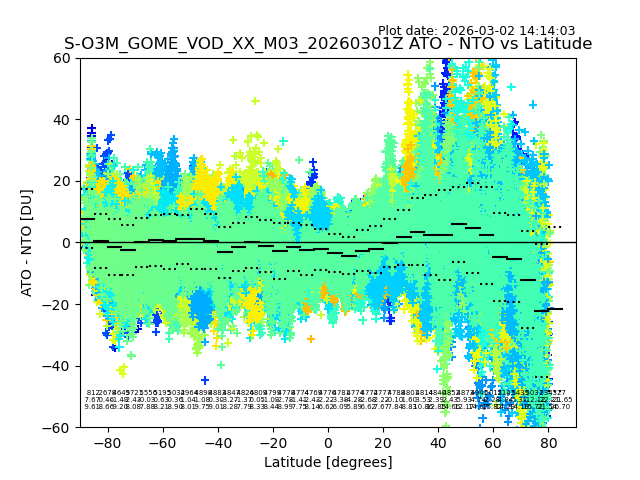 The date given in the title of the plot indicates the T=0 day for which the NTO/O3 data is compared. Example: S-O3M_GOME_VOD__M02_20110117Z indicates that the plot is for data from 2011-01-17 00:00 up NTO/O3 files starting at 2011-01-17 23:59 is used.