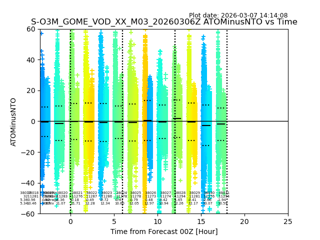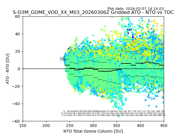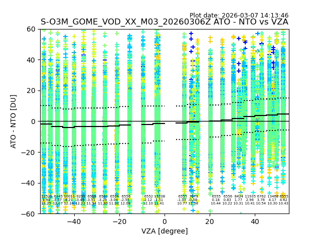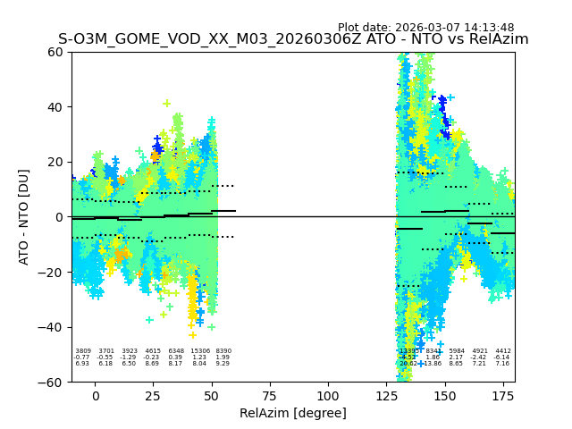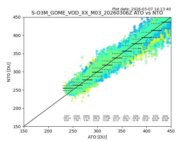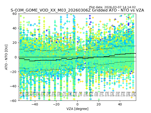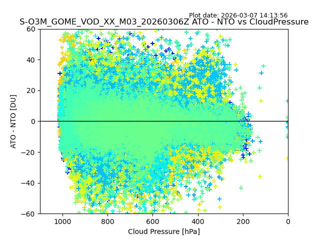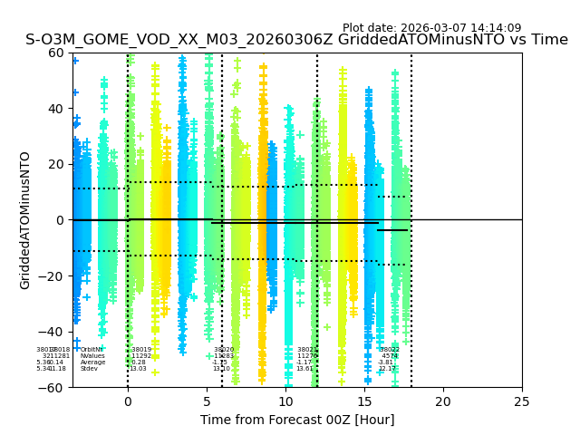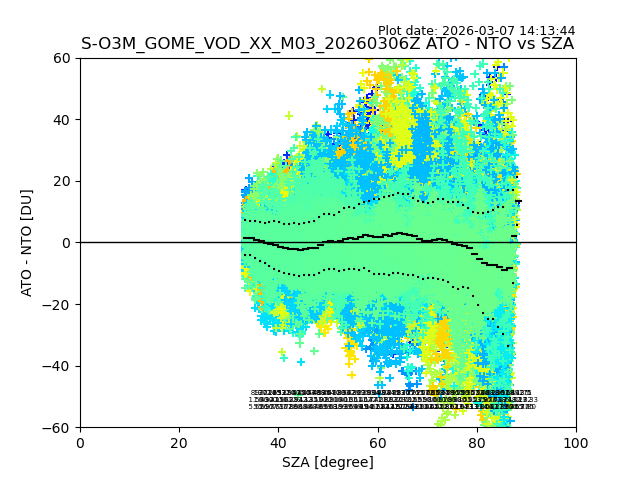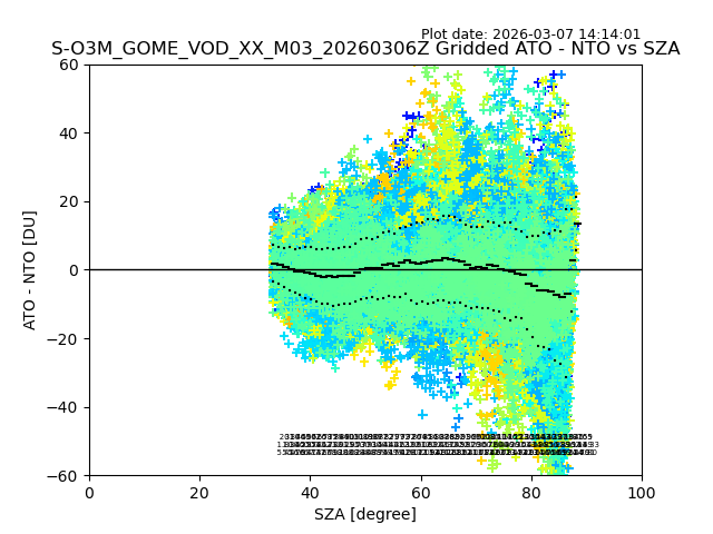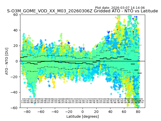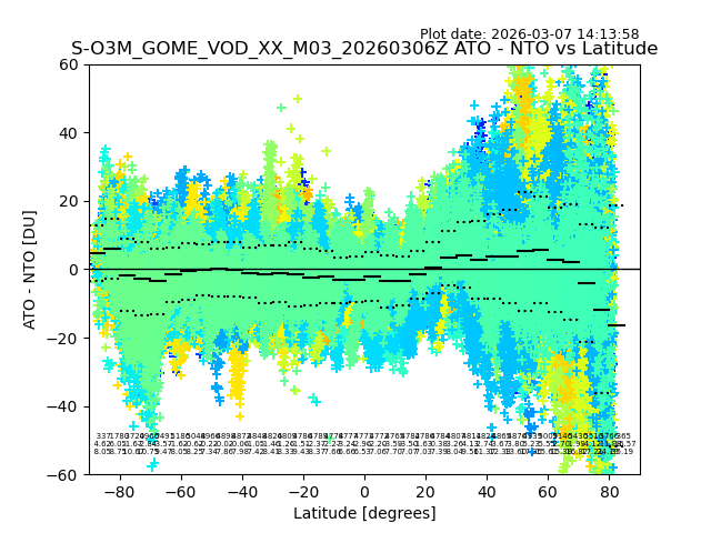 The date given in the title of the plot indicates the T=0 day for which the NTO/O3 data is compared. Example: S-O3M_GOME_VOD__M02_20110117Z indicates that the plot is for data from 2011-01-17 00:00 up NTO/O3 files starting at 2011-01-17 23:59 is used.