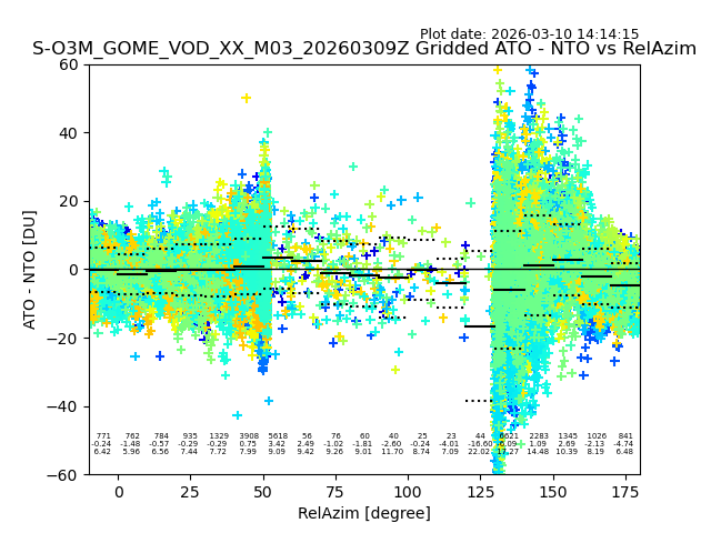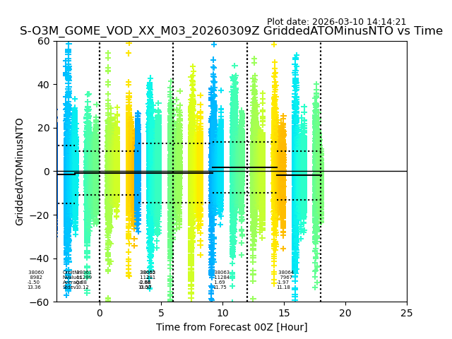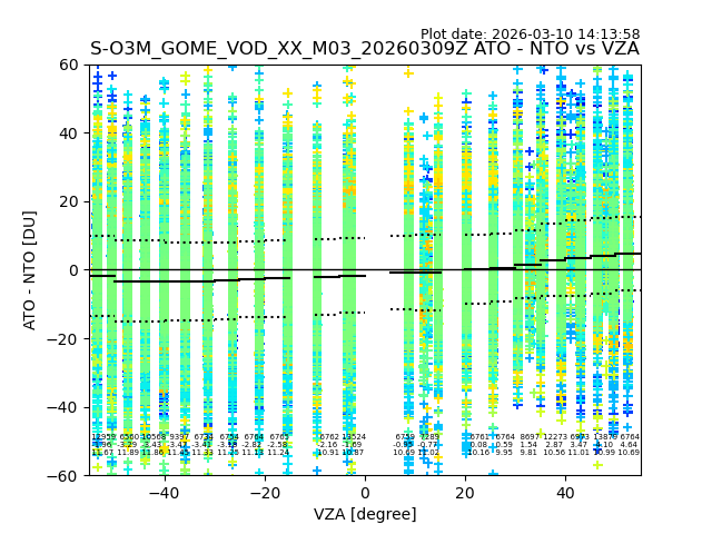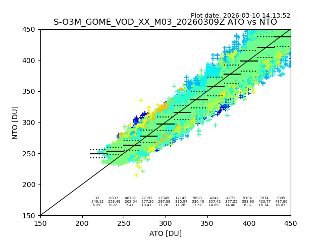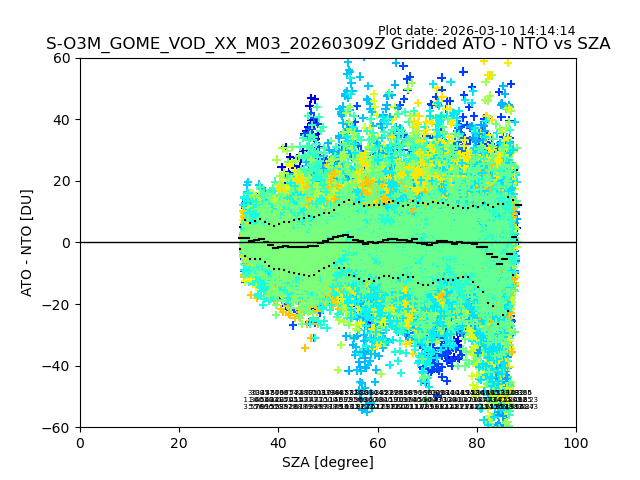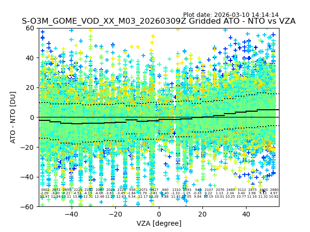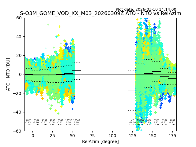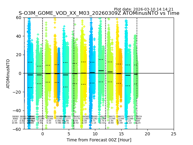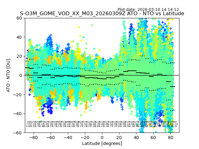 The date given in the title of the plot indicates the T=0 day for which the NTO/O3 data is compared. Example: S-O3M_GOME_VOD__M02_20110117Z indicates that the plot is for data from 2011-01-17 00:00 up NTO/O3 files starting at 2011-01-17 23:59 is used.