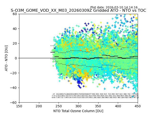 Using these forecast fields, the actual measured NTO/O3 from T=0 to T+24h can be compared. The comparison can be between each individual NTO/O3 retrieval and the ATO value in the associated grid box, or between 'pre-gridded' NTO/O3 values and the ATO value. Both these comparisons are given.