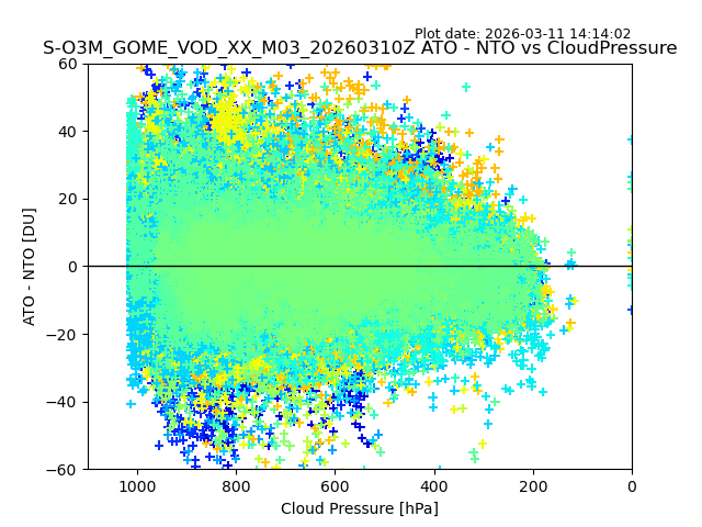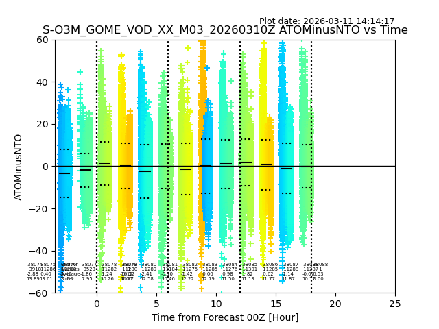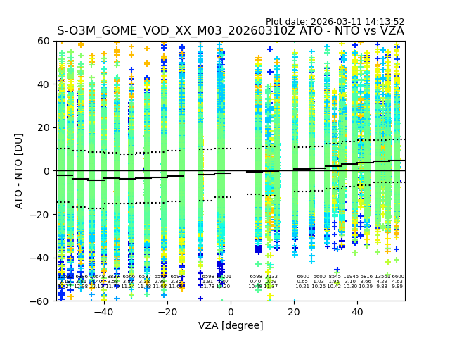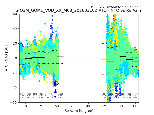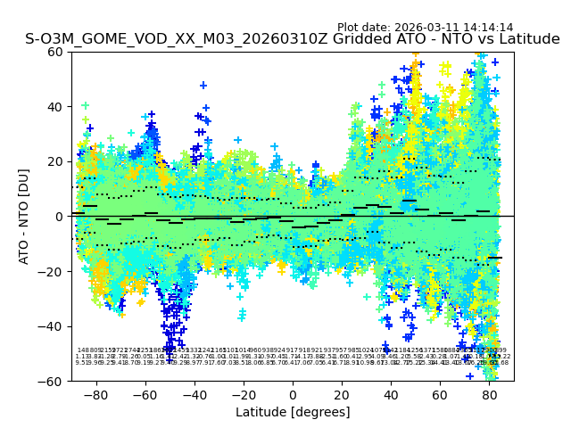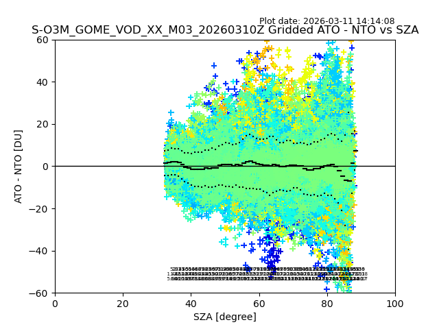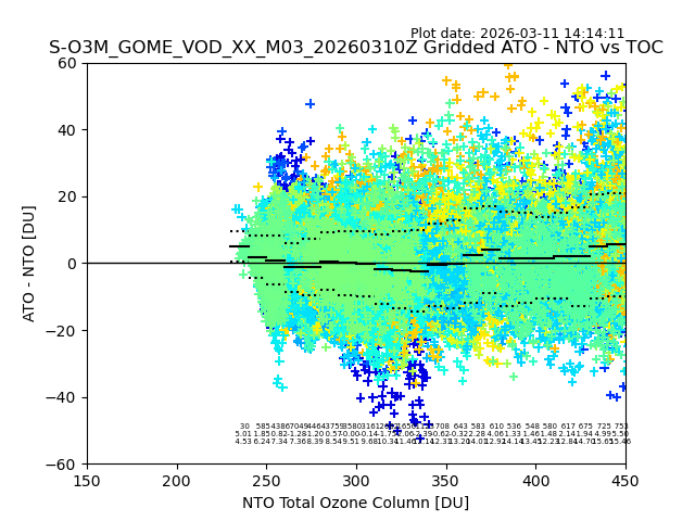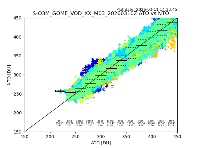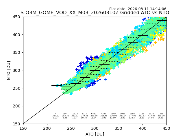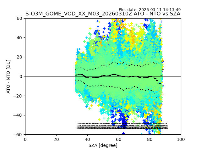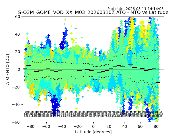 The date given in the title of the plot indicates the T=0 day for which the NTO/O3 data is compared. Example: S-O3M_GOME_VOD__M02_20110117Z indicates that the plot is for data from 2011-01-17 00:00 up NTO/O3 files starting at 2011-01-17 23:59 is used.