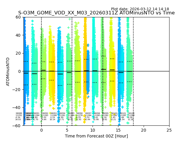 Using these forecast fields, the actual measured NTO/O3 from T=0 to T+24h can be compared. The comparison can be between each individual NTO/O3 retrieval and the ATO value in the associated grid box, or between 'pre-gridded' NTO/O3 values and the ATO value. Both these comparisons are given.