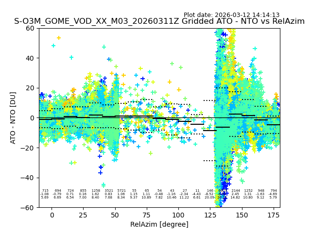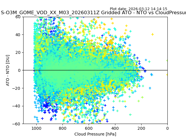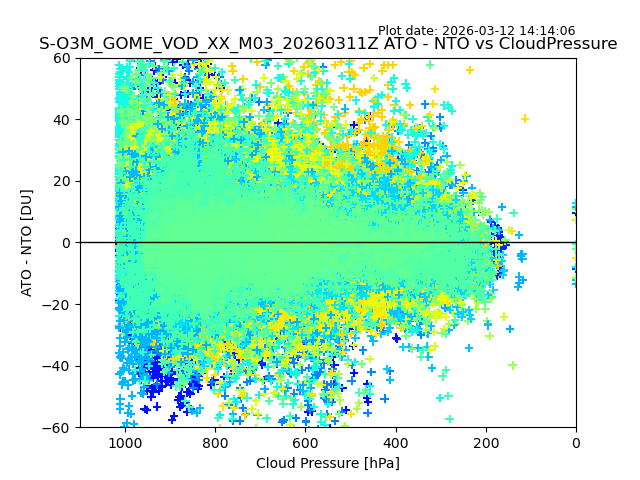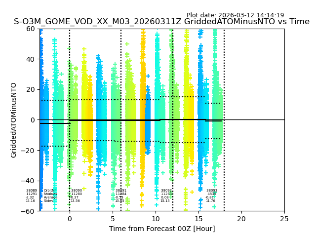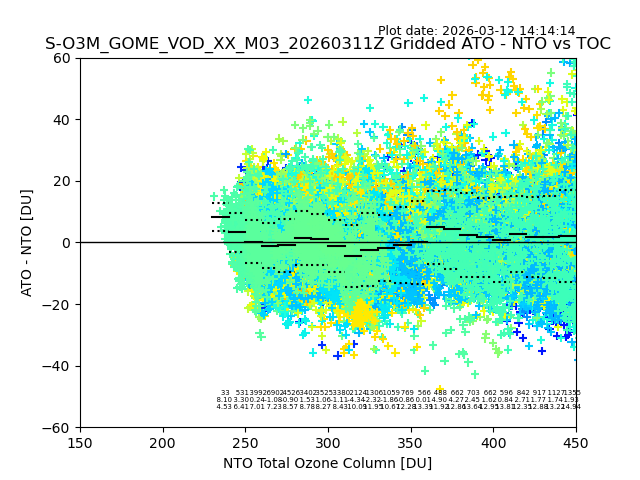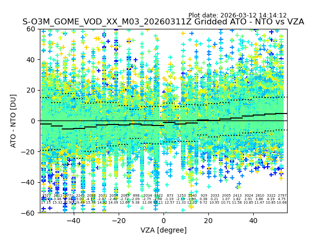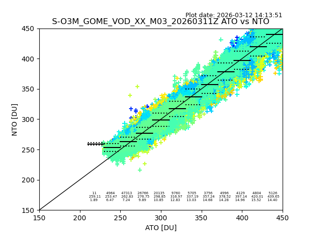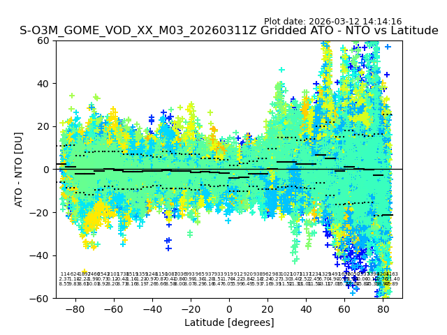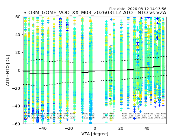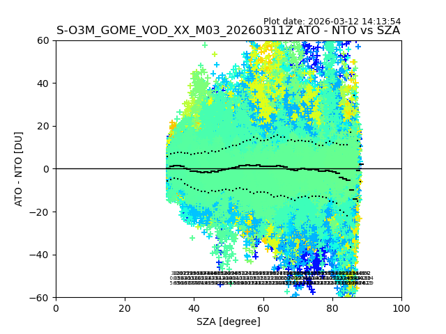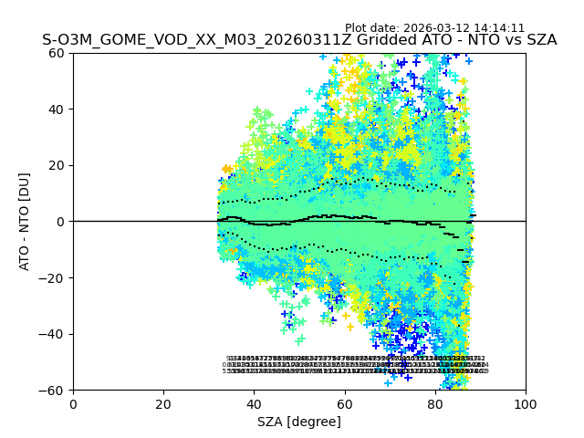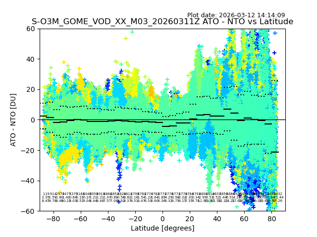 The date given in the title of the plot indicates the T=0 day for which the NTO/O3 data is compared. Example: S-O3M_GOME_VOD__M02_20110117Z indicates that the plot is for data from 2011-01-17 00:00 up NTO/O3 files starting at 2011-01-17 23:59 is used.