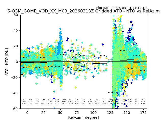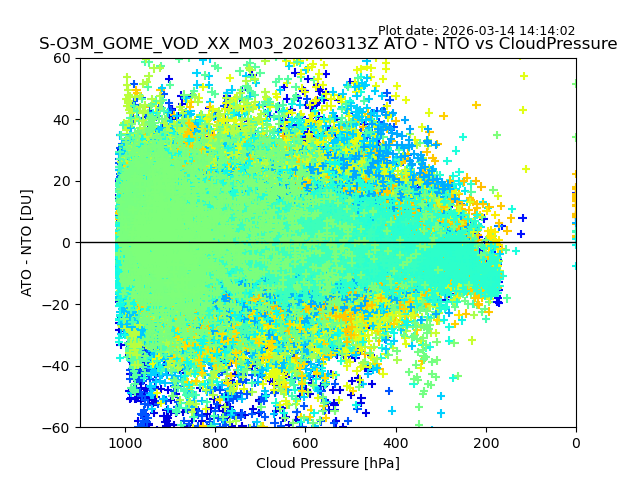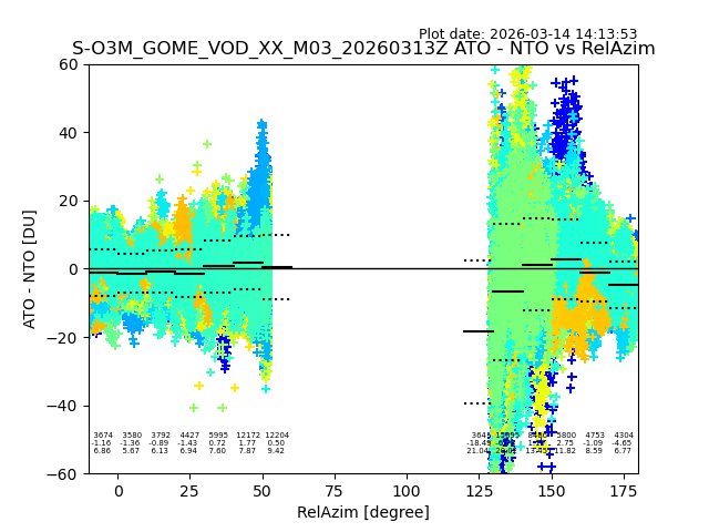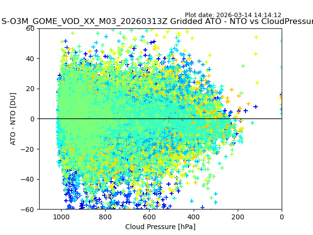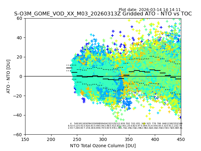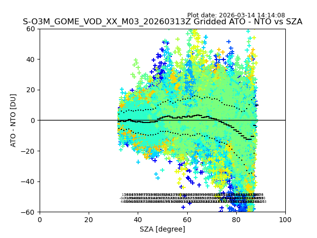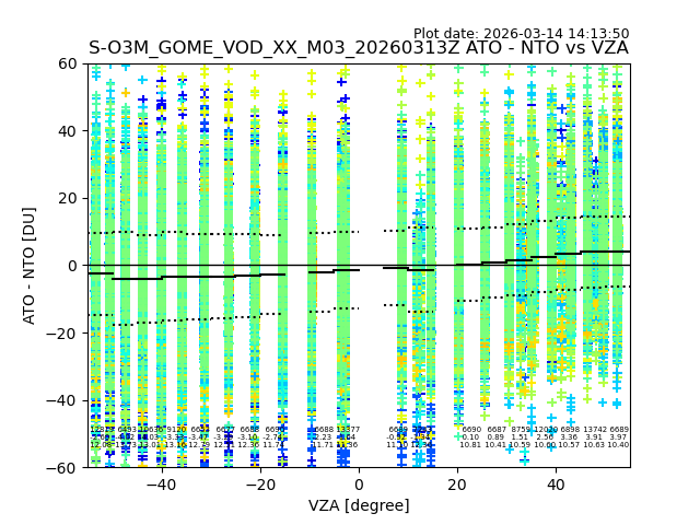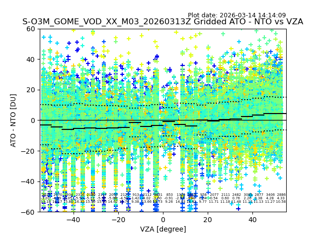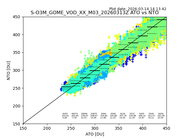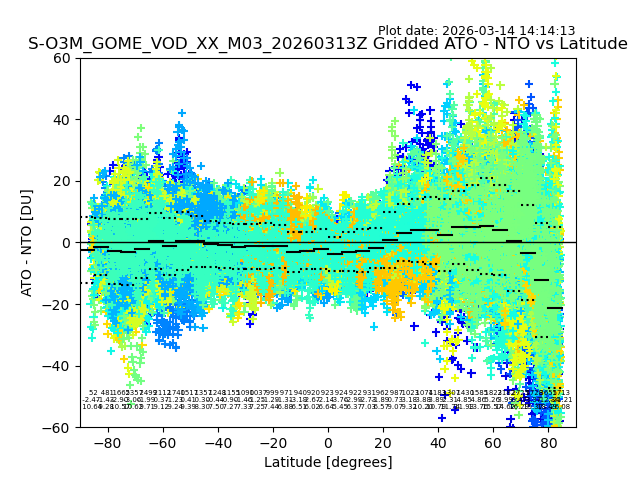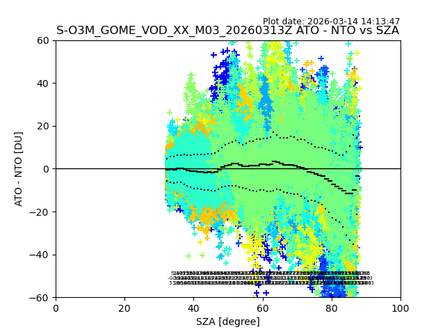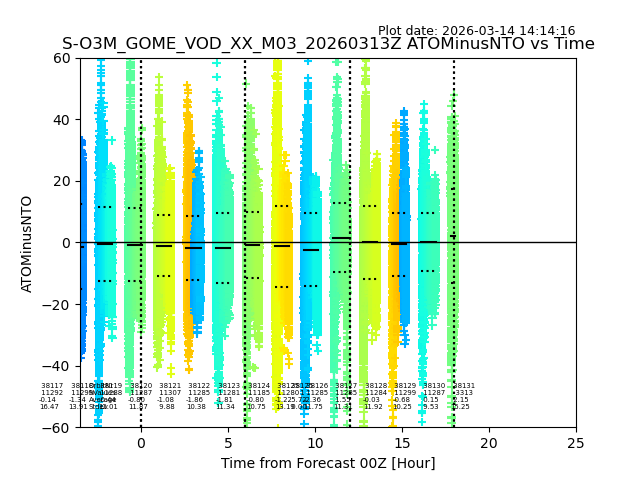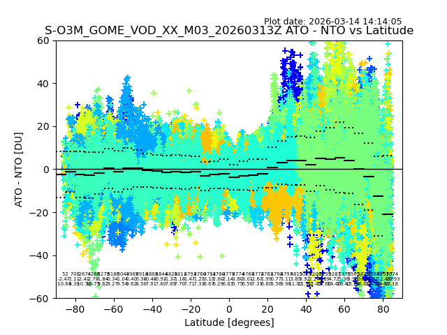 The date given in the title of the plot indicates the T=0 day for which the NTO/O3 data is compared. Example: S-O3M_GOME_VOD__M02_20110117Z indicates that the plot is for data from 2011-01-17 00:00 up NTO/O3 files starting at 2011-01-17 23:59 is used.