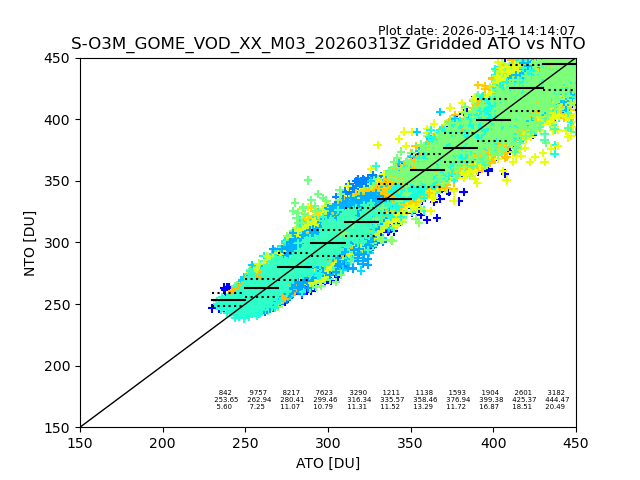Using these forecast fields, the actual measured NTO/O3 from T=0 to T+24h can be compared. The comparison can be between each individual NTO/O3 retrieval and the ATO value in the associated grid box, or between 'pre-gridded' NTO/O3 values and the ATO value. Both these comparisons are given.