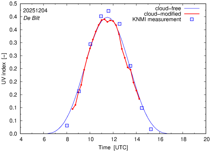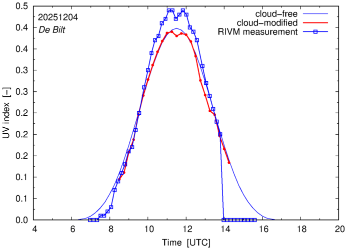 Comparison of the cloud-modified UV index with RIVM and KNMI UV index measurements is based on the higher resolution (0.05 by 0.05°) data using the location of 'De Bilt' for both institutes and is available up to yesterday.