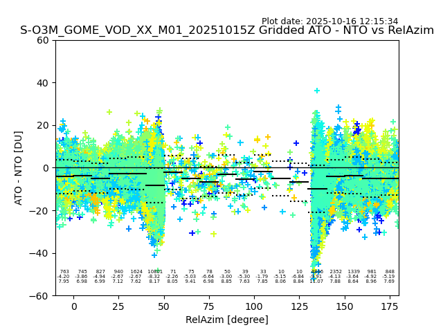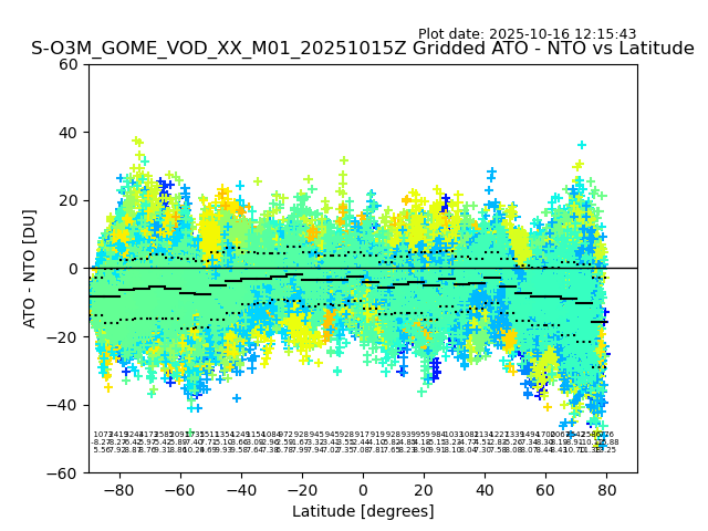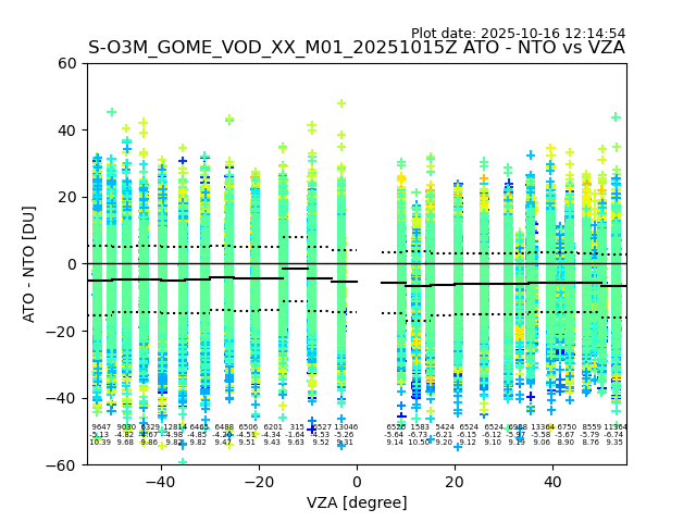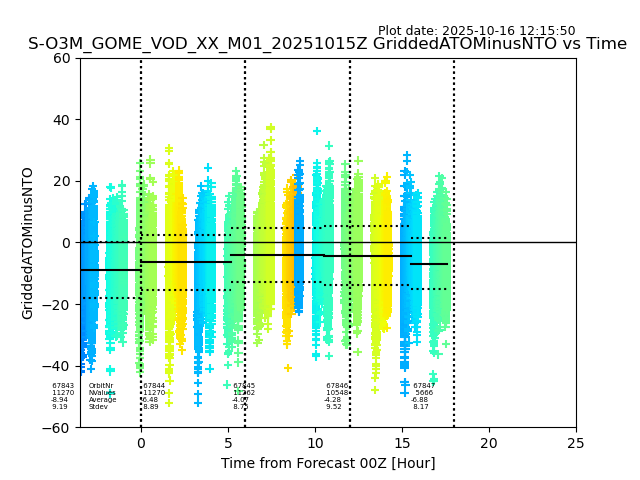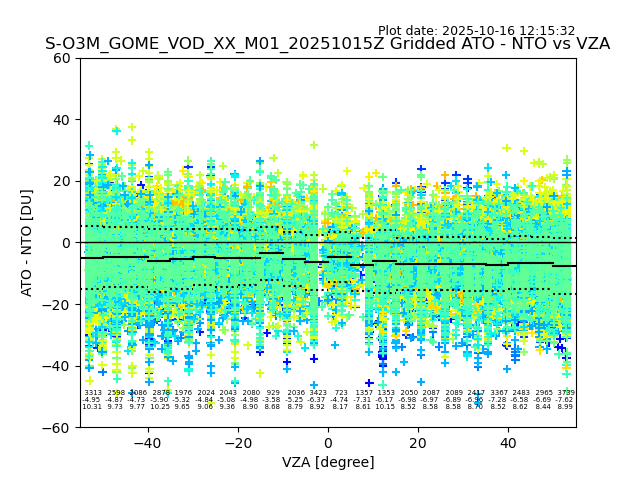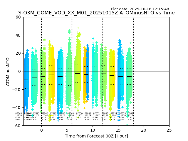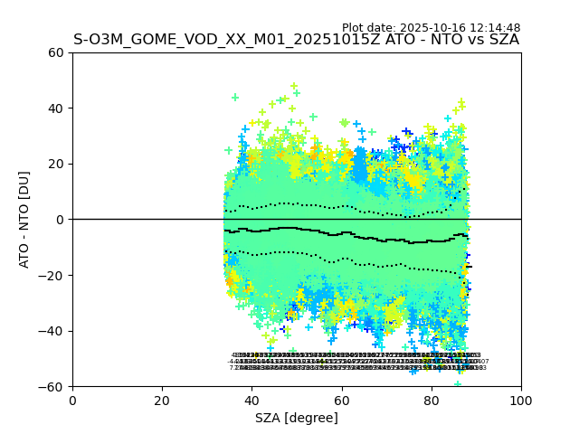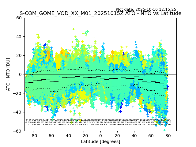 The date given in the title of the plot indicates the T=0 day for which the NTO/O3 data is compared. Example: S-O3M_GOME_VOD__M02_20110117Z indicates that the plot is for data from 2011-01-17 00:00 up NTO/O3 files starting at 2011-01-17 23:59 is used.