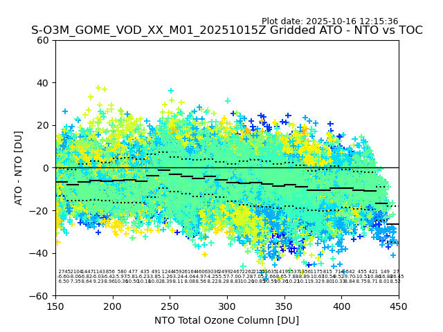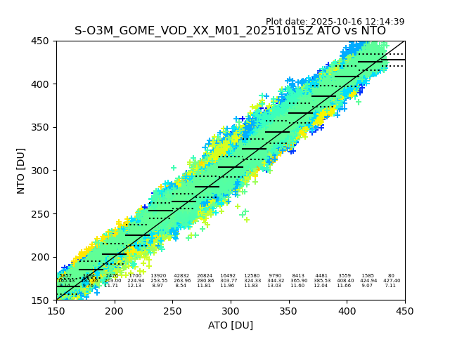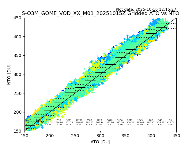 Using these forecast fields, the actual measured NTO/O3 from T=0 to T+24h can be compared. The comparison can be between each individual NTO/O3 retrieval and the ATO value in the associated grid box, or between 'pre-gridded' NTO/O3 values and the ATO value. Both these comparisons are given.