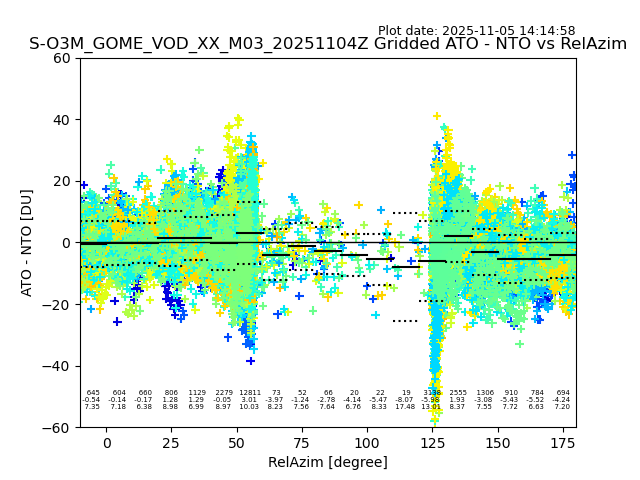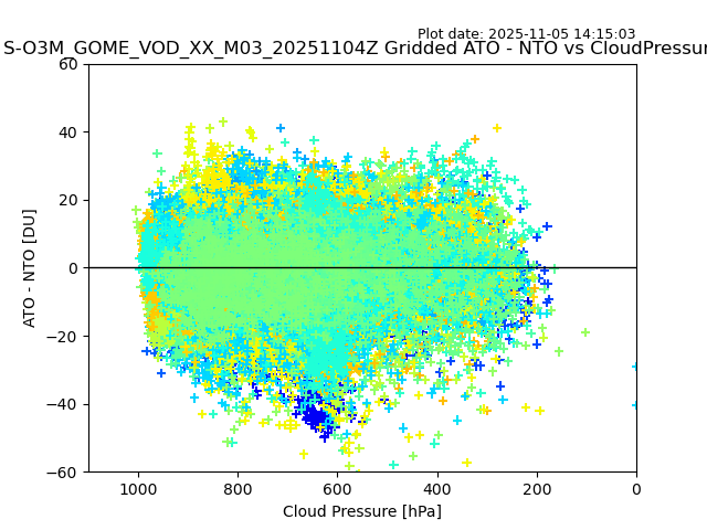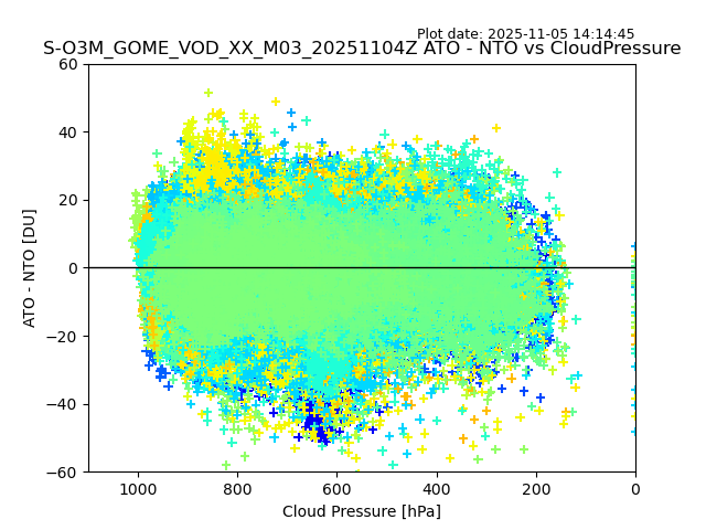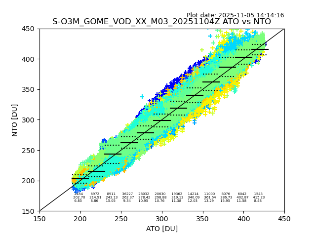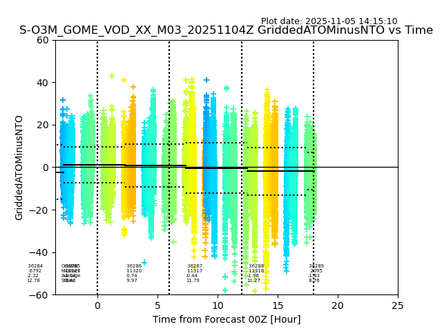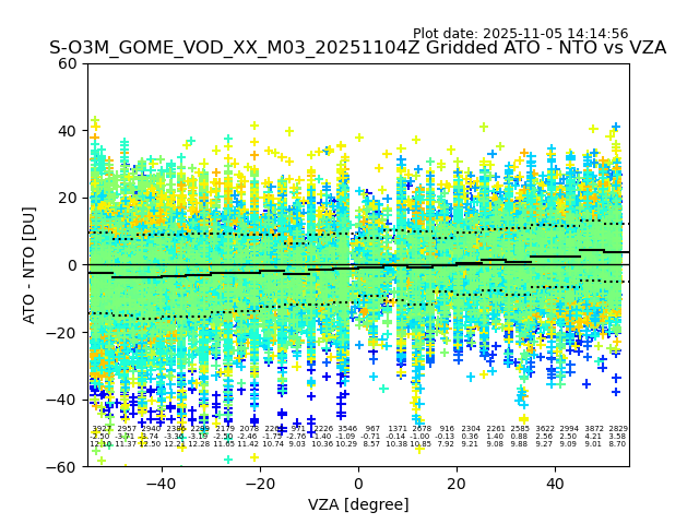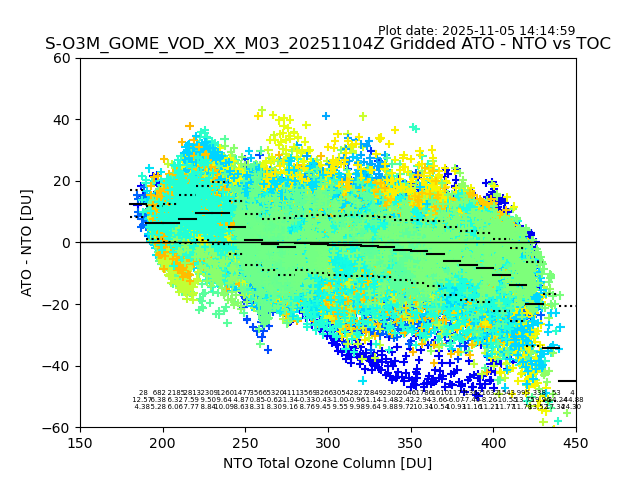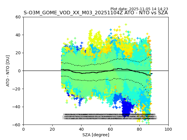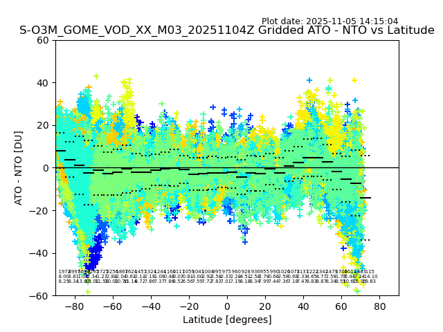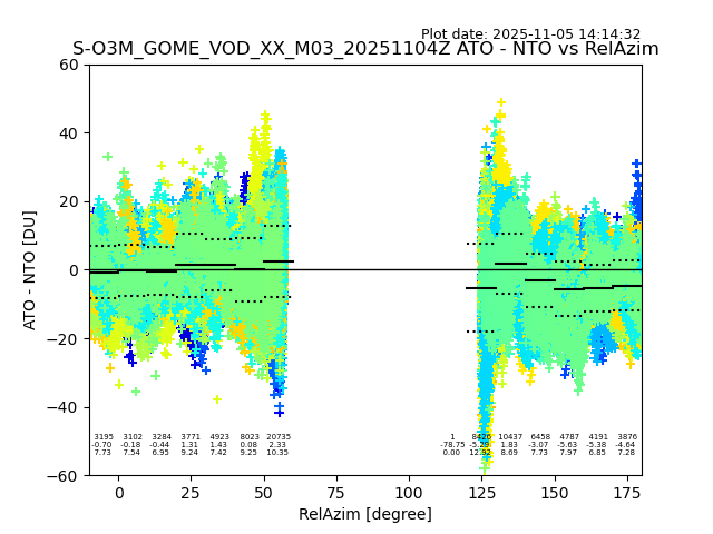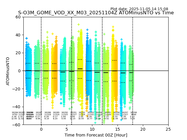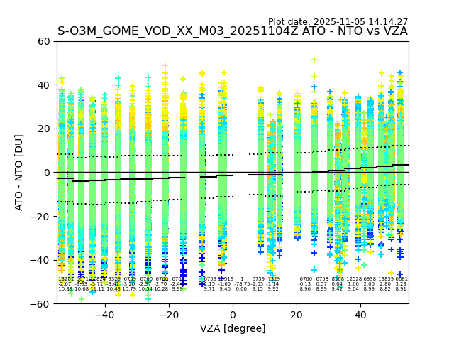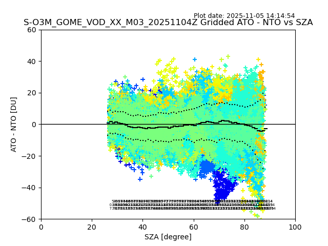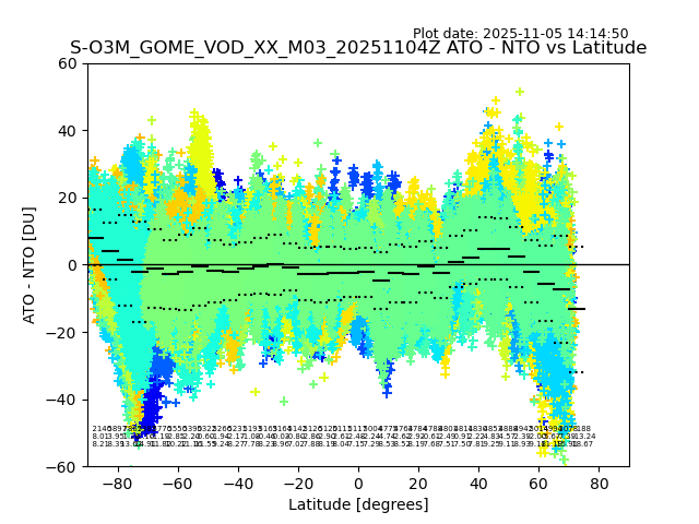 The date given in the title of the plot indicates the T=0 day for which the NTO/O3 data is compared. Example: S-O3M_GOME_VOD__M02_20110117Z indicates that the plot is for data from 2011-01-17 00:00 up NTO/O3 files starting at 2011-01-17 23:59 is used.