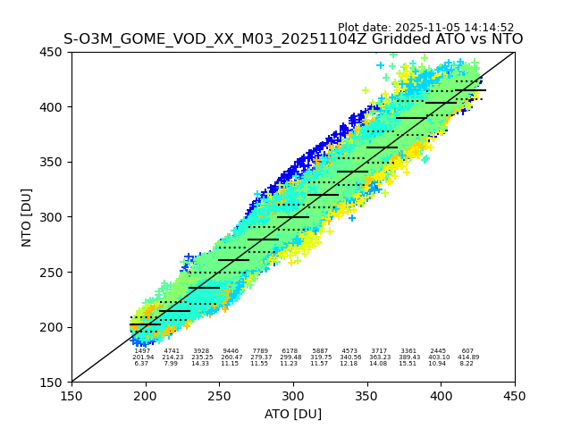 Using these forecast fields, the actual measured NTO/O3 from T=0 to T+24h can be compared. The comparison can be between each individual NTO/O3 retrieval and the ATO value in the associated grid box, or between 'pre-gridded' NTO/O3 values and the ATO value. Both these comparisons are given.