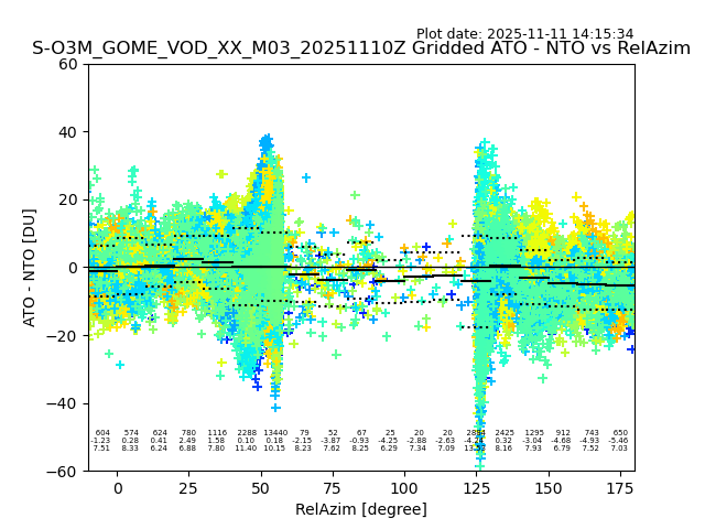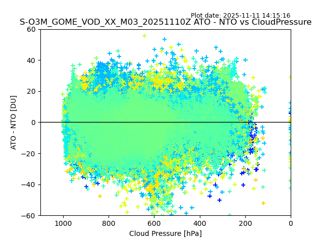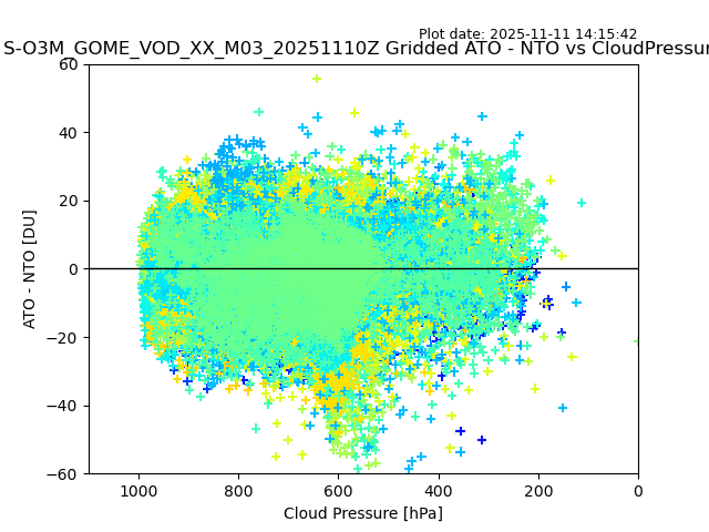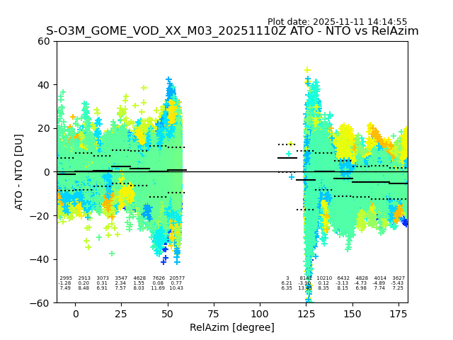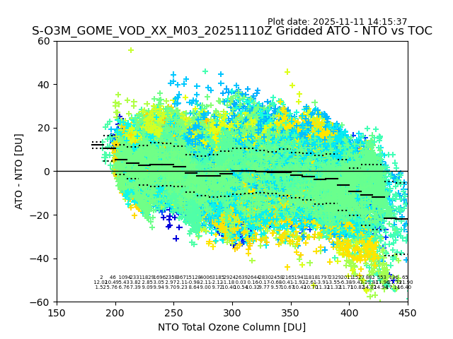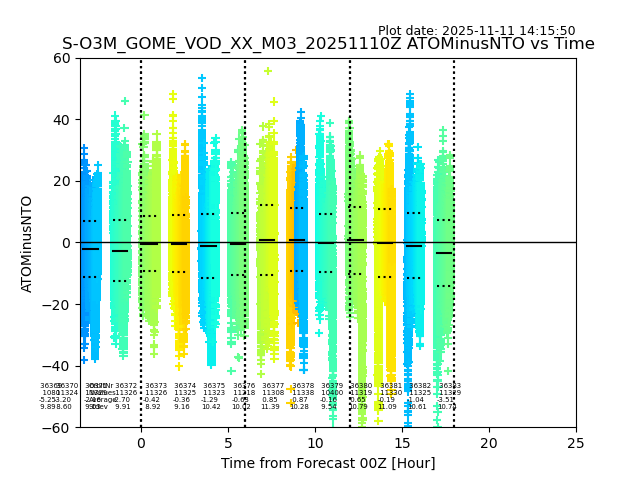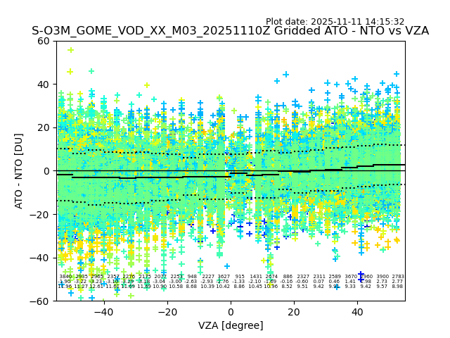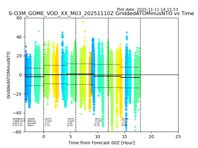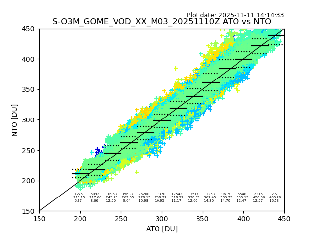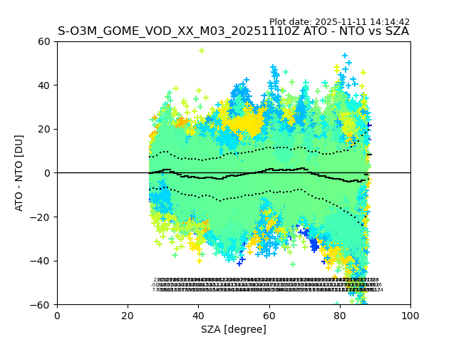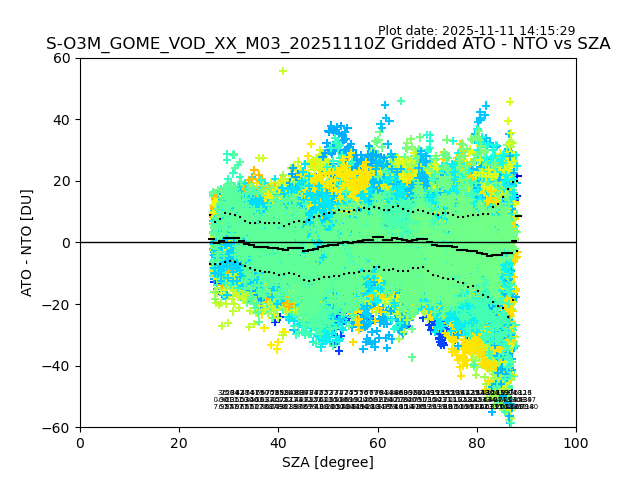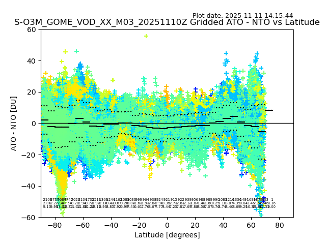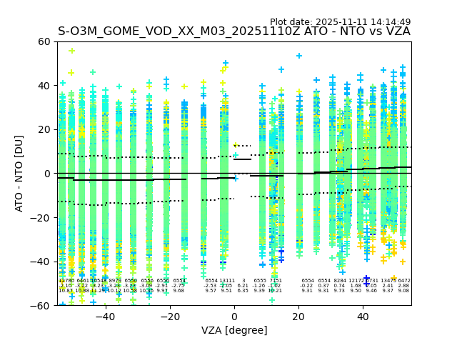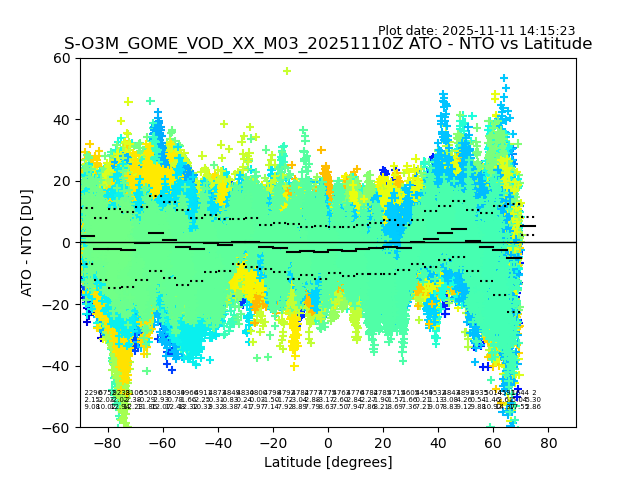 The date given in the title of the plot indicates the T=0 day for which the NTO/O3 data is compared. Example: S-O3M_GOME_VOD__M02_20110117Z indicates that the plot is for data from 2011-01-17 00:00 up NTO/O3 files starting at 2011-01-17 23:59 is used.