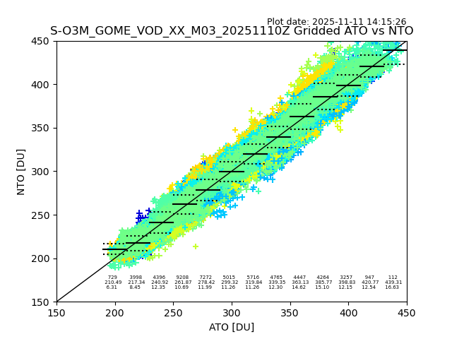 Using these forecast fields, the actual measured NTO/O3 from T=0 to T+24h can be compared. The comparison can be between each individual NTO/O3 retrieval and the ATO value in the associated grid box, or between 'pre-gridded' NTO/O3 values and the ATO value. Both these comparisons are given.