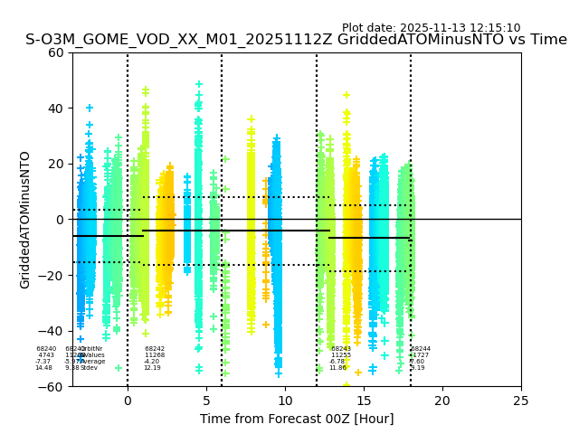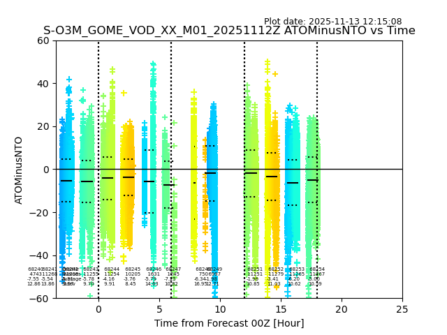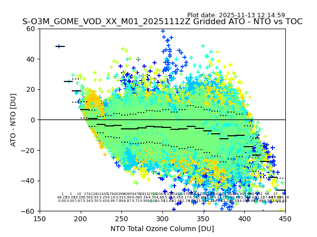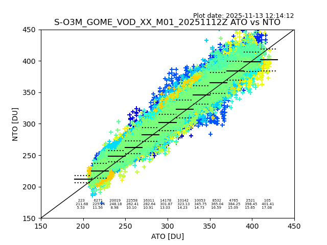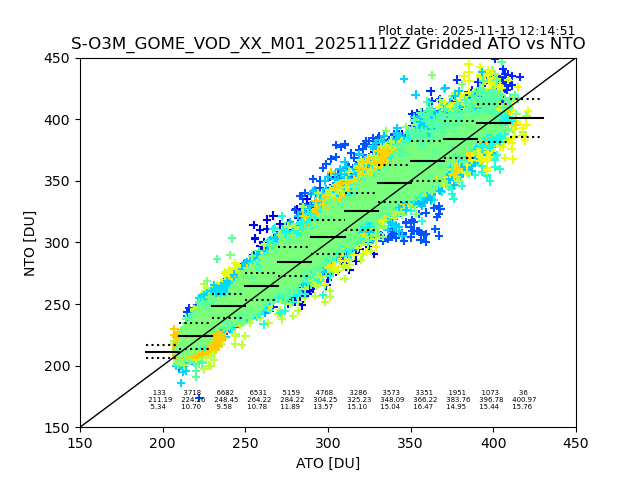 Using these forecast fields, the actual measured NTO/O3 from T=0 to T+24h can be compared. The comparison can be between each individual NTO/O3 retrieval and the ATO value in the associated grid box, or between 'pre-gridded' NTO/O3 values and the ATO value. Both these comparisons are given.