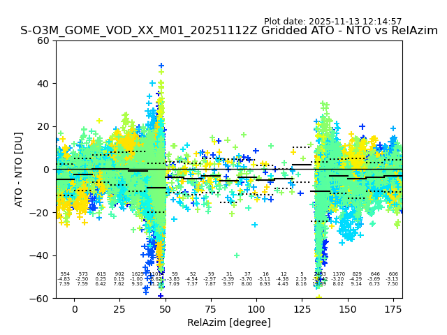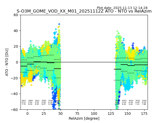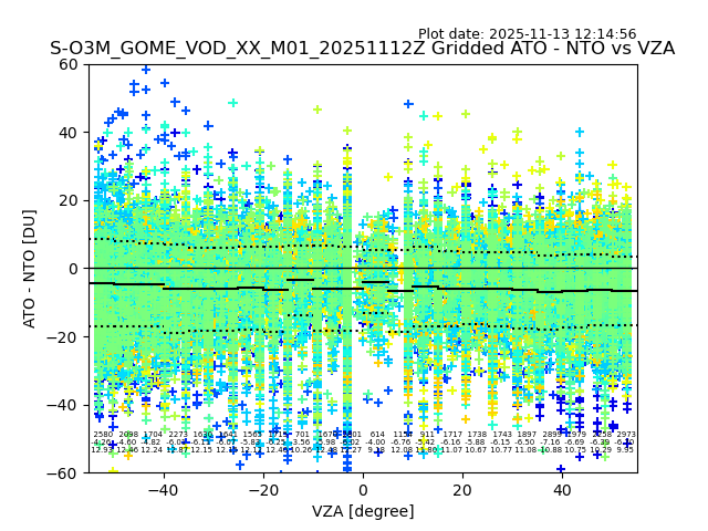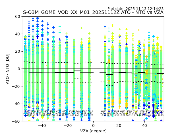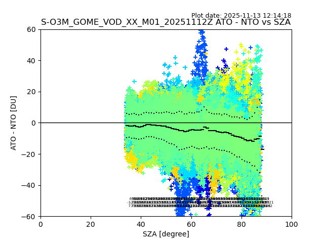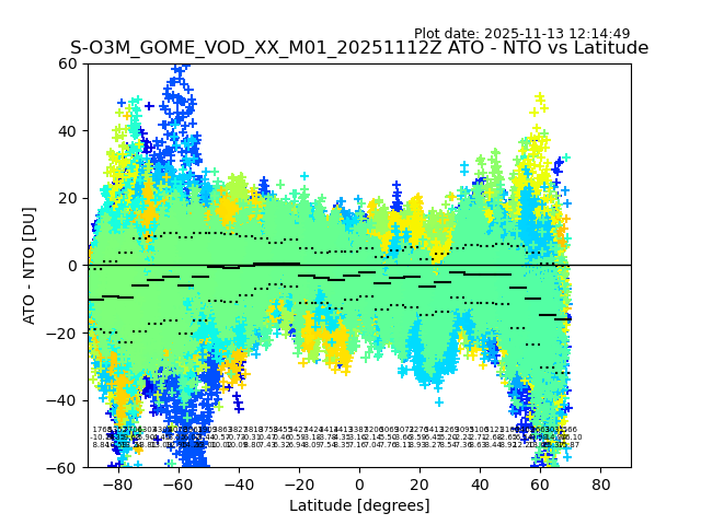 The date given in the title of the plot indicates the T=0 day for which the NTO/O3 data is compared. Example: S-O3M_GOME_VOD__M02_20110117Z indicates that the plot is for data from 2011-01-17 00:00 up NTO/O3 files starting at 2011-01-17 23:59 is used.