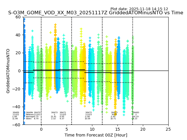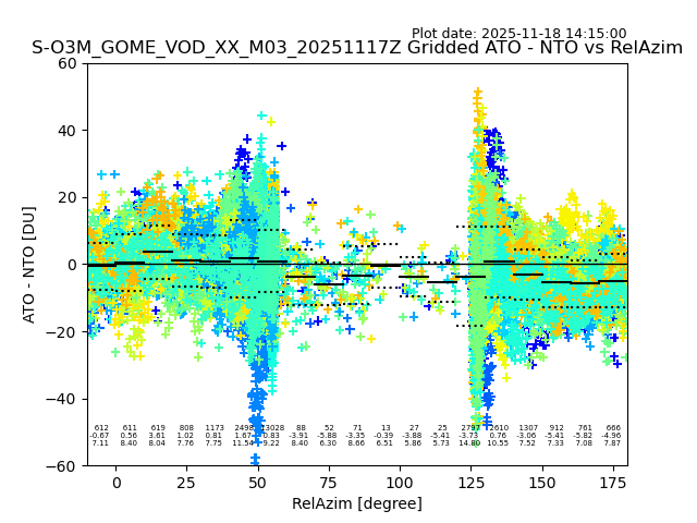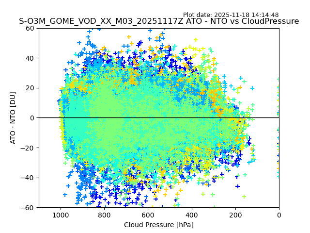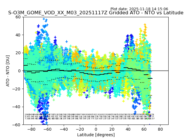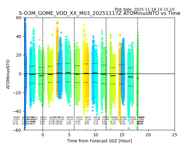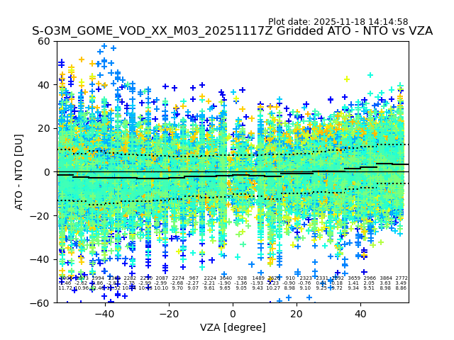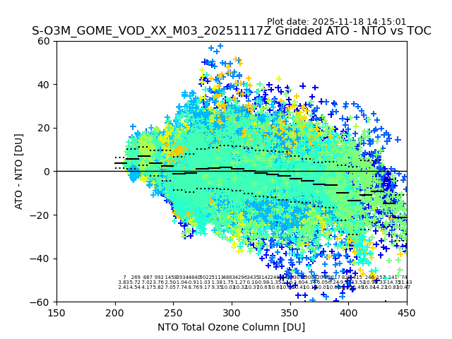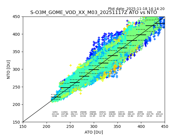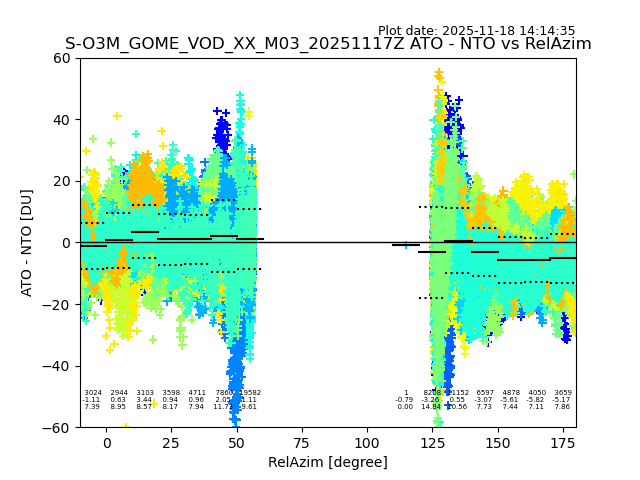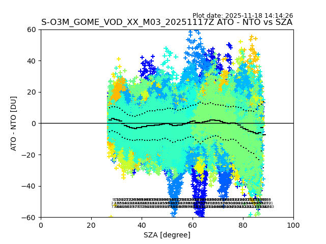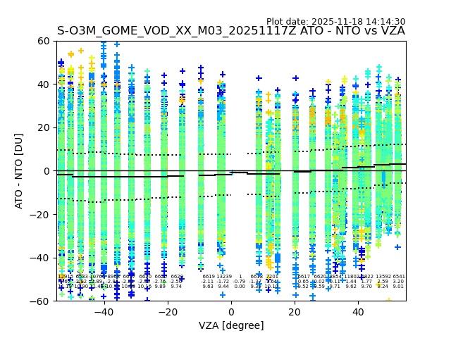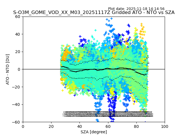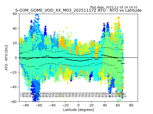 The date given in the title of the plot indicates the T=0 day for which the NTO/O3 data is compared. Example: S-O3M_GOME_VOD__M02_20110117Z indicates that the plot is for data from 2011-01-17 00:00 up NTO/O3 files starting at 2011-01-17 23:59 is used.