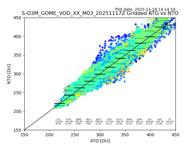 Using these forecast fields, the actual measured NTO/O3 from T=0 to T+24h can be compared. The comparison can be between each individual NTO/O3 retrieval and the ATO value in the associated grid box, or between 'pre-gridded' NTO/O3 values and the ATO value. Both these comparisons are given.