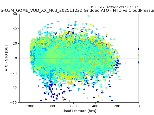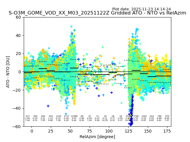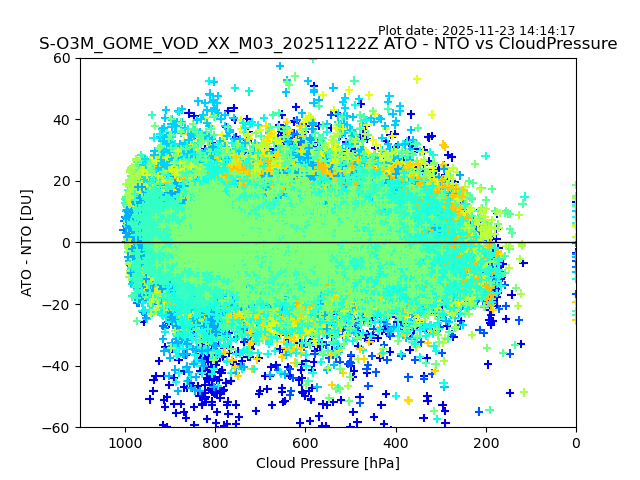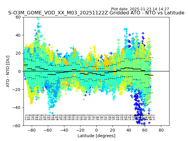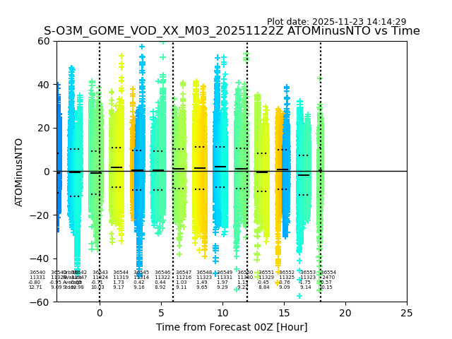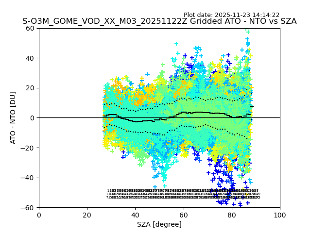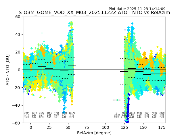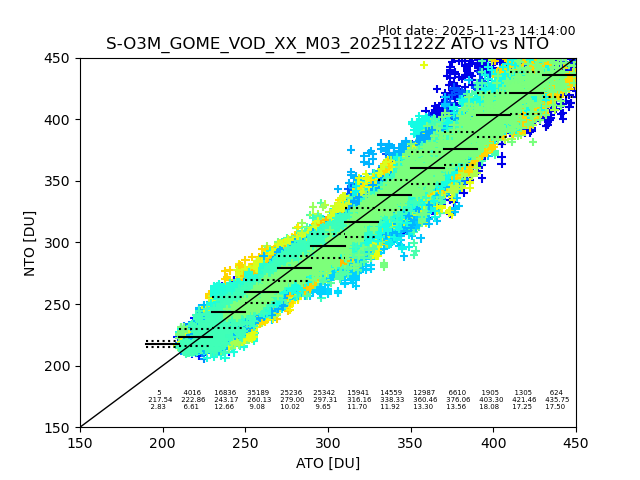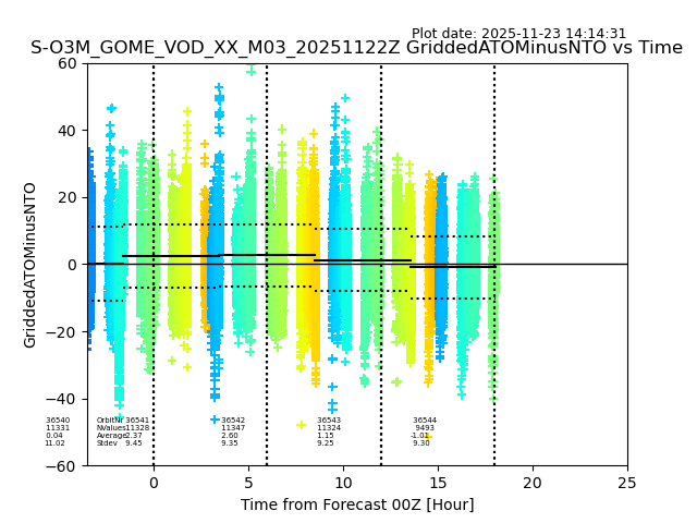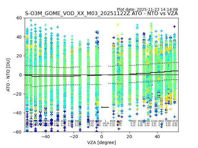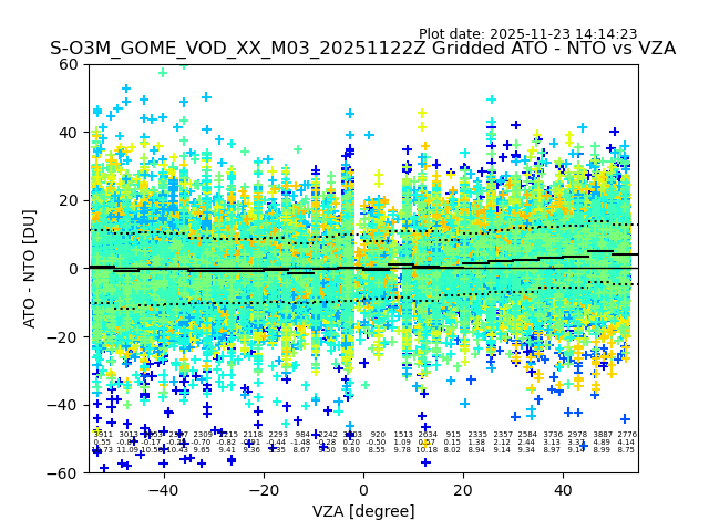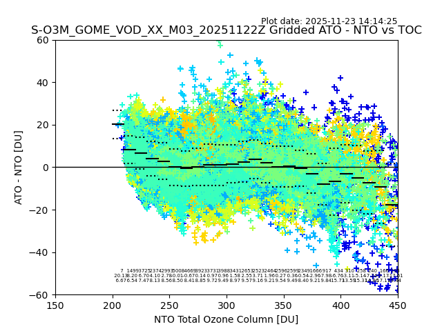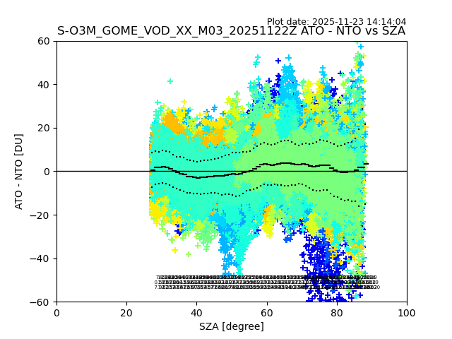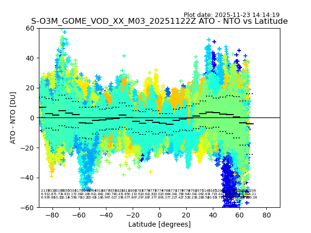 The date given in the title of the plot indicates the T=0 day for which the NTO/O3 data is compared. Example: S-O3M_GOME_VOD__M02_20110117Z indicates that the plot is for data from 2011-01-17 00:00 up NTO/O3 files starting at 2011-01-17 23:59 is used.
