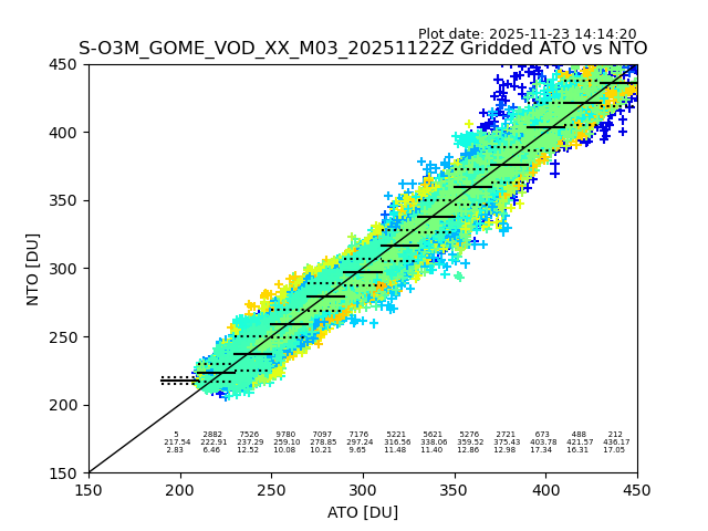 Using these forecast fields, the actual measured NTO/O3 from T=0 to T+24h can be compared. The comparison can be between each individual NTO/O3 retrieval and the ATO value in the associated grid box, or between 'pre-gridded' NTO/O3 values and the ATO value. Both these comparisons are given.