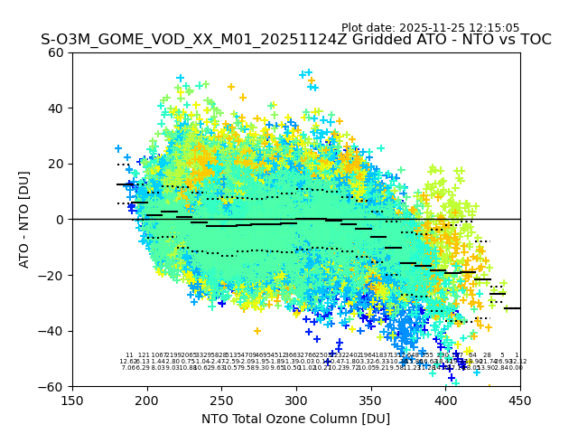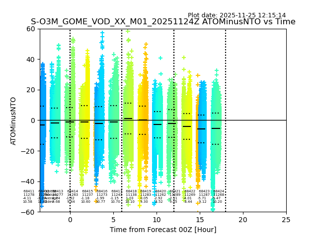 Using these forecast fields, the actual measured NTO/O3 from T=0 to T+24h can be compared. The comparison can be between each individual NTO/O3 retrieval and the ATO value in the associated grid box, or between 'pre-gridded' NTO/O3 values and the ATO value. Both these comparisons are given.