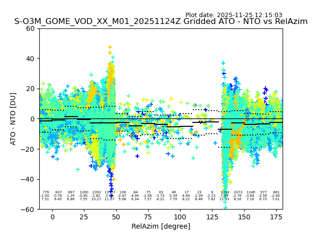 The date given in the title of the plot indicates the T=0 day for which the NTO/O3 data is compared. Example: S-O3M_GOME_VOD__M02_20110117Z indicates that the plot is for data from 2011-01-17 00:00 up NTO/O3 files starting at 2011-01-17 23:59 is used.