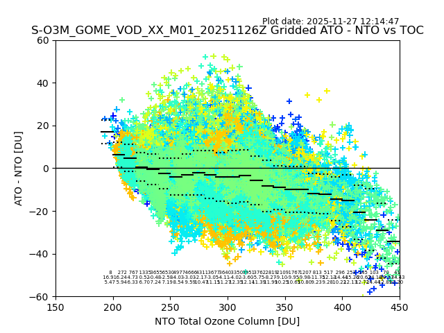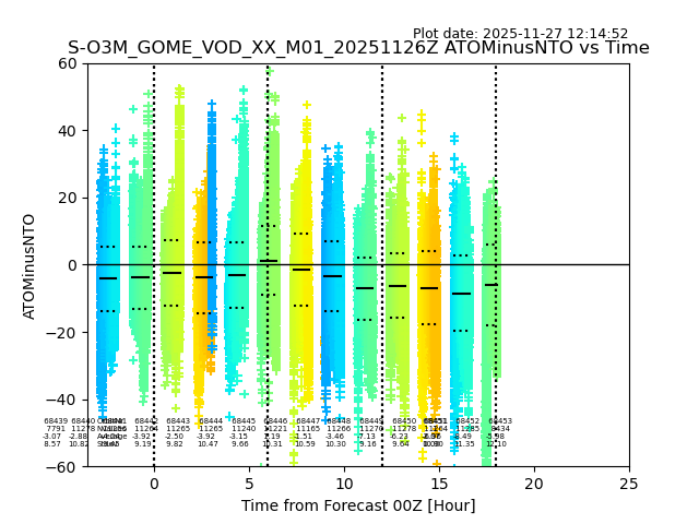 Using these forecast fields, the actual measured NTO/O3 from T=0 to T+24h can be compared. The comparison can be between each individual NTO/O3 retrieval and the ATO value in the associated grid box, or between 'pre-gridded' NTO/O3 values and the ATO value. Both these comparisons are given.