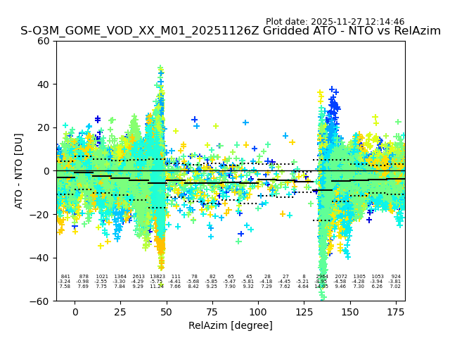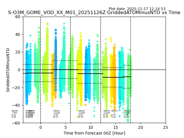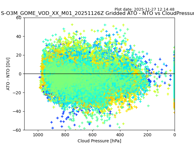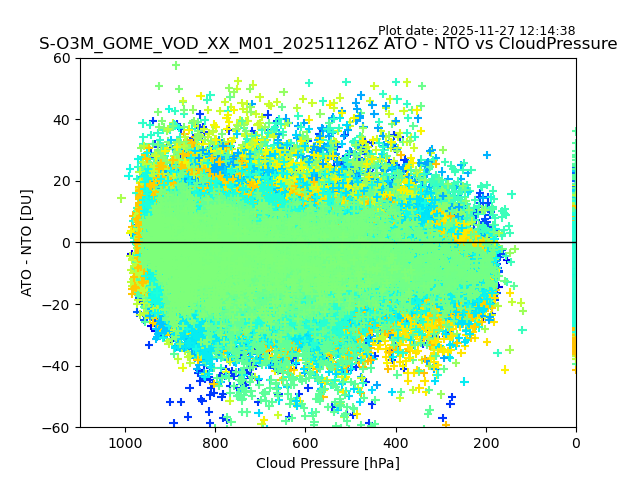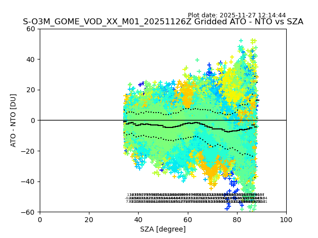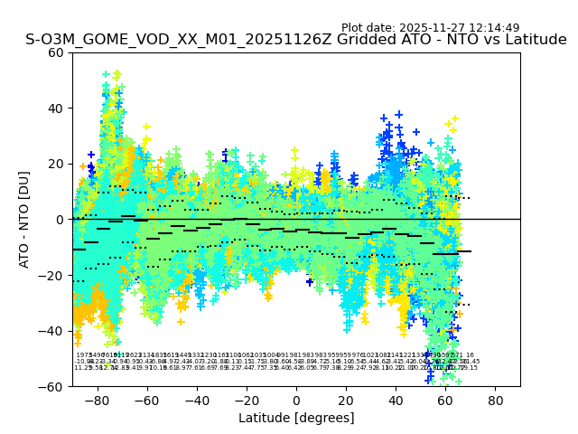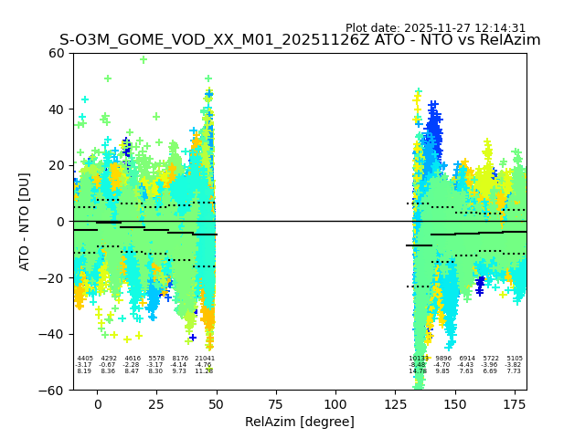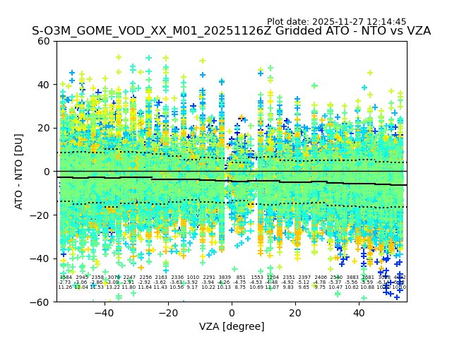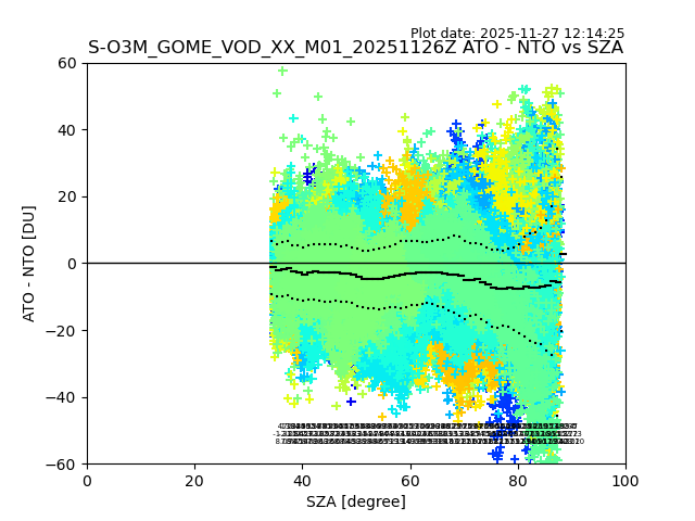 The date given in the title of the plot indicates the T=0 day for which the NTO/O3 data is compared. Example: S-O3M_GOME_VOD__M02_20110117Z indicates that the plot is for data from 2011-01-17 00:00 up NTO/O3 files starting at 2011-01-17 23:59 is used.