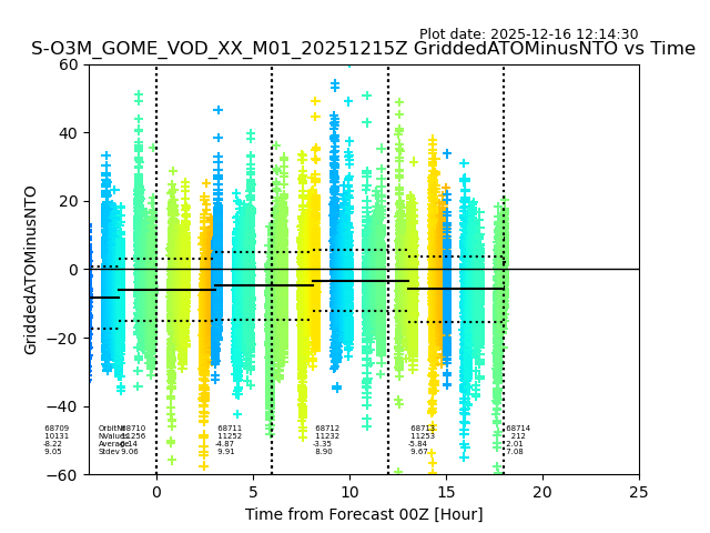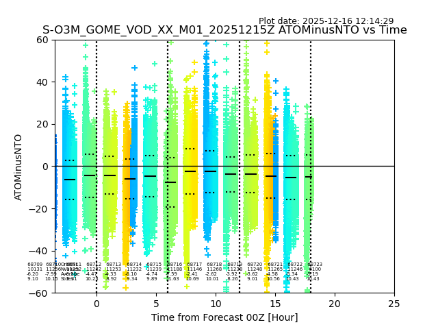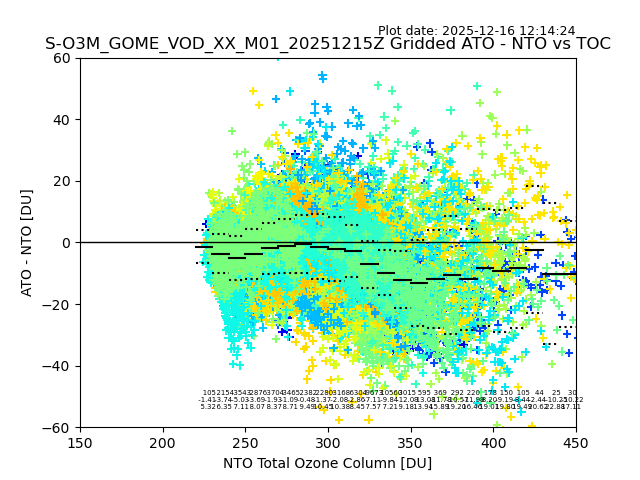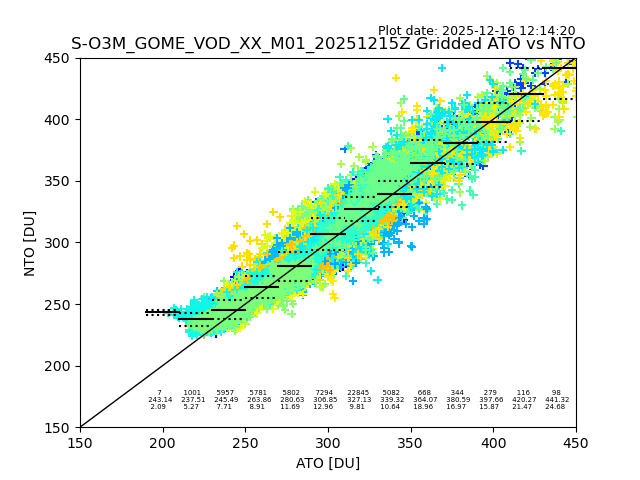 Using these forecast fields, the actual measured NTO/O3 from T=0 to T+24h can be compared. The comparison can be between each individual NTO/O3 retrieval and the ATO value in the associated grid box, or between 'pre-gridded' NTO/O3 values and the ATO value. Both these comparisons are given.
