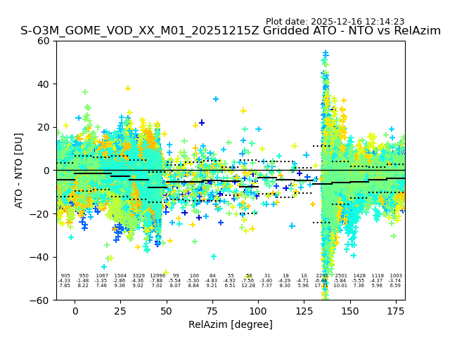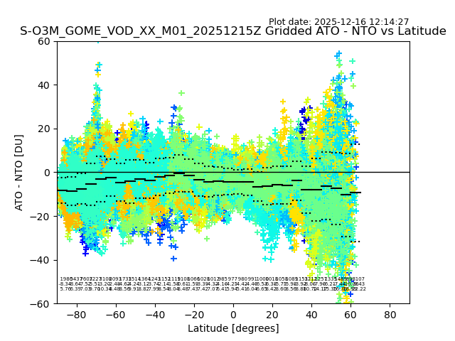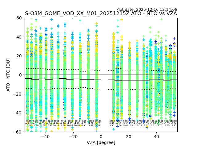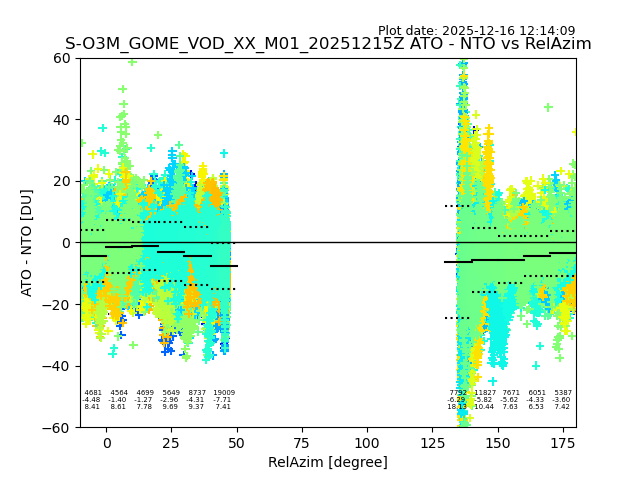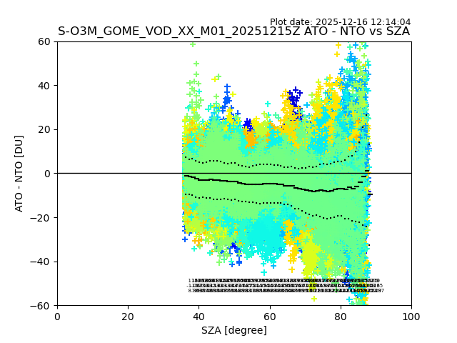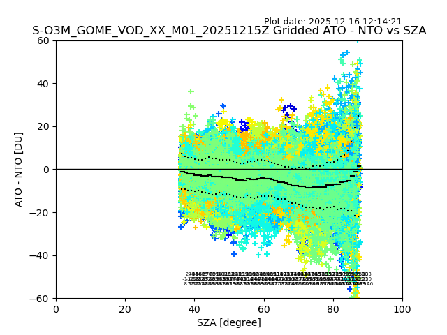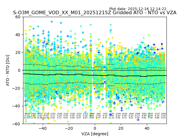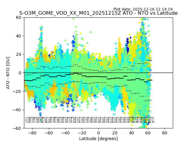 The date given in the title of the plot indicates the T=0 day for which the NTO/O3 data is compared. Example: S-O3M_GOME_VOD__M02_20110117Z indicates that the plot is for data from 2011-01-17 00:00 up NTO/O3 files starting at 2011-01-17 23:59 is used.