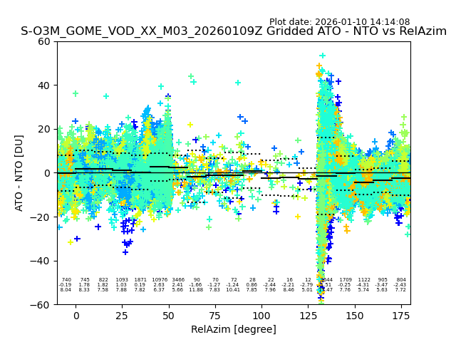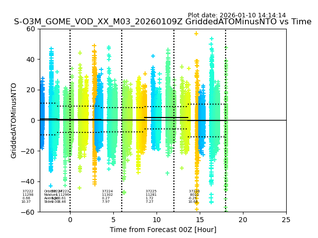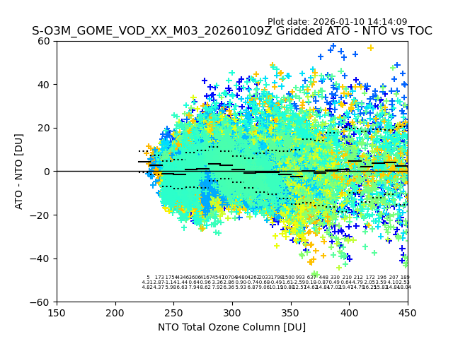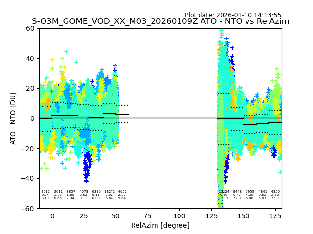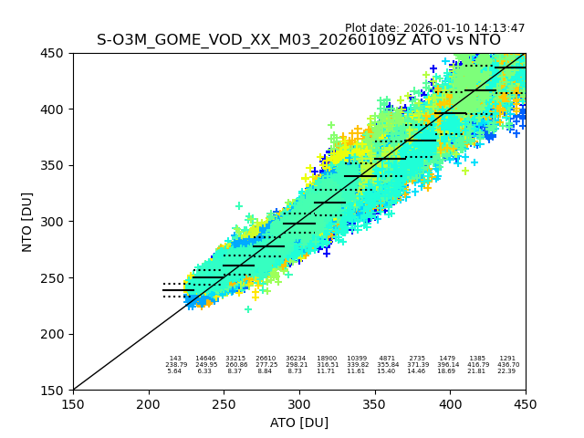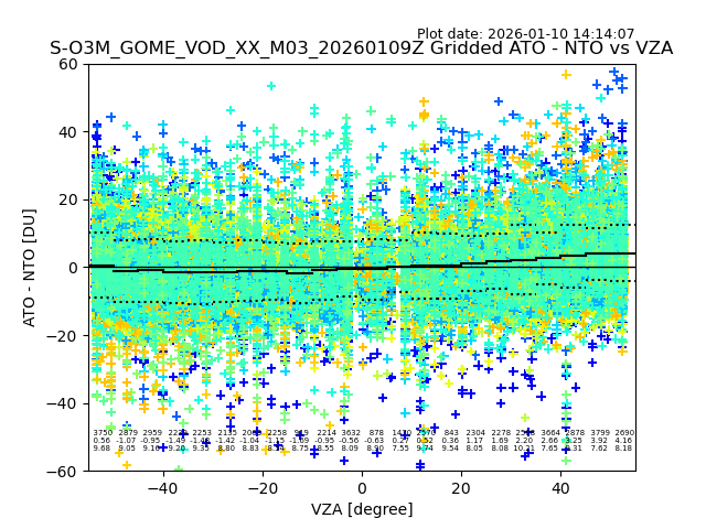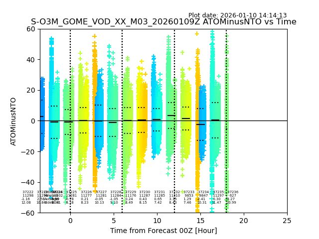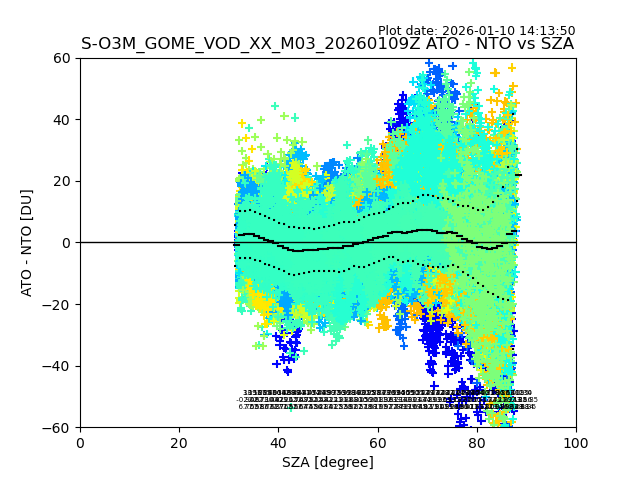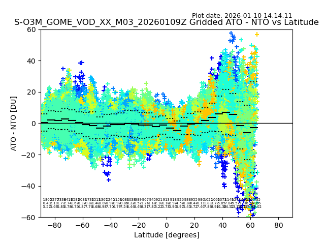 The date given in the title of the plot indicates the T=0 day for which the NTO/O3 data is compared. Example: S-O3M_GOME_VOD__M02_20110117Z indicates that the plot is for data from 2011-01-17 00:00 up NTO/O3 files starting at 2011-01-17 23:59 is used.