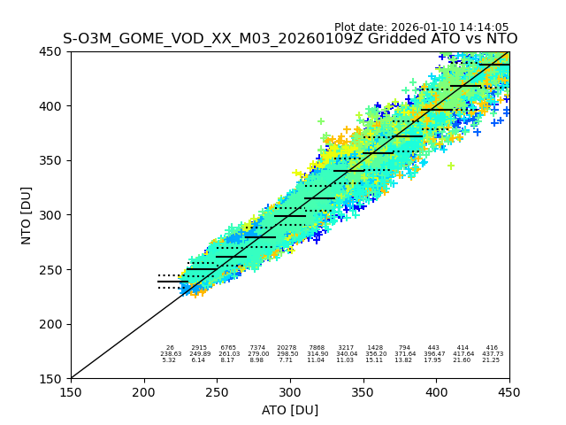 Using these forecast fields, the actual measured NTO/O3 from T=0 to T+24h can be compared. The comparison can be between each individual NTO/O3 retrieval and the ATO value in the associated grid box, or between 'pre-gridded' NTO/O3 values and the ATO value. Both these comparisons are given.