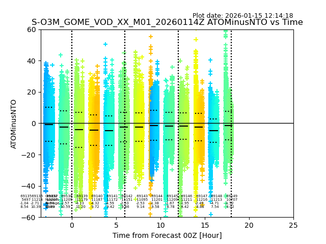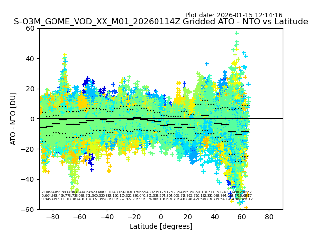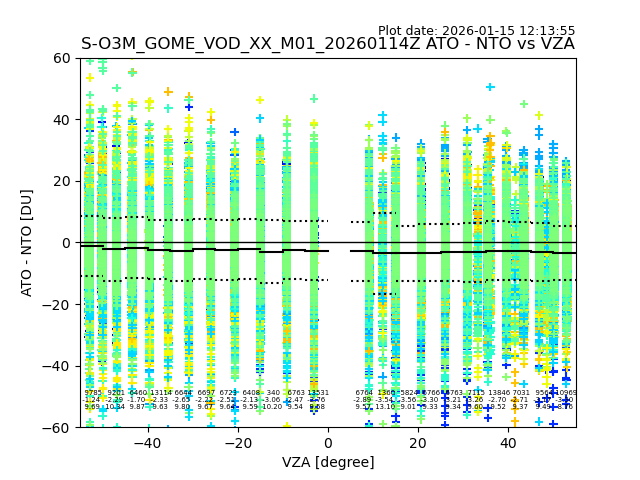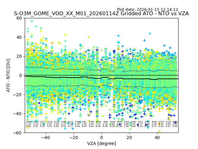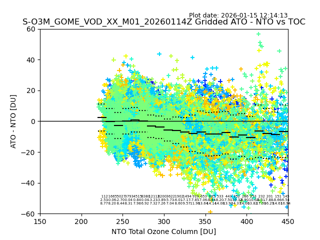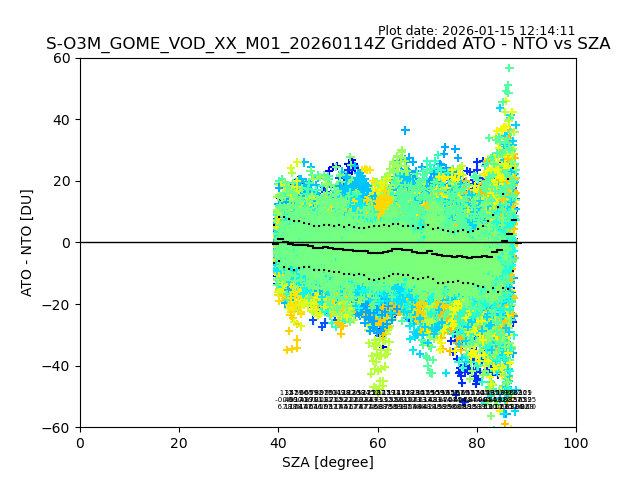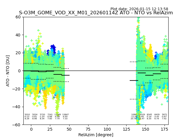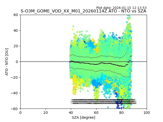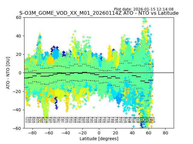 The date given in the title of the plot indicates the T=0 day for which the NTO/O3 data is compared. Example: S-O3M_GOME_VOD__M02_20110117Z indicates that the plot is for data from 2011-01-17 00:00 up NTO/O3 files starting at 2011-01-17 23:59 is used.