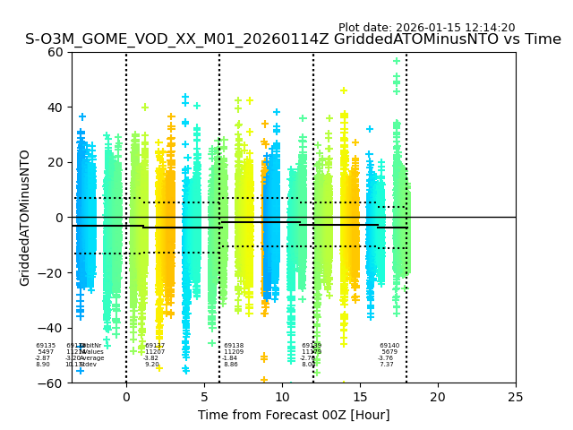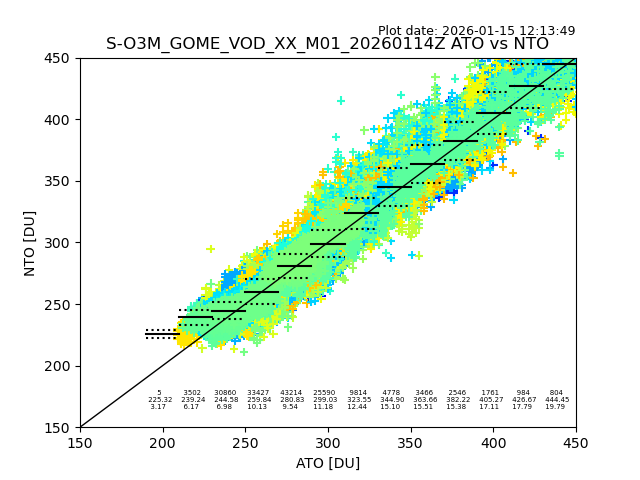 Using these forecast fields, the actual measured NTO/O3 from T=0 to T+24h can be compared. The comparison can be between each individual NTO/O3 retrieval and the ATO value in the associated grid box, or between 'pre-gridded' NTO/O3 values and the ATO value. Both these comparisons are given.