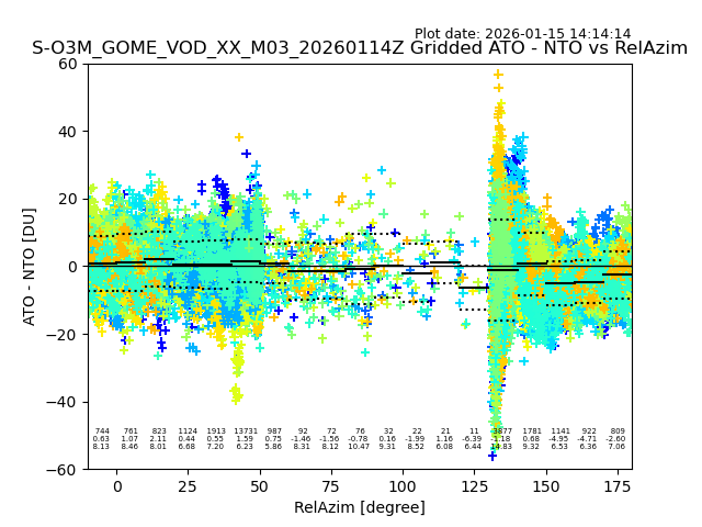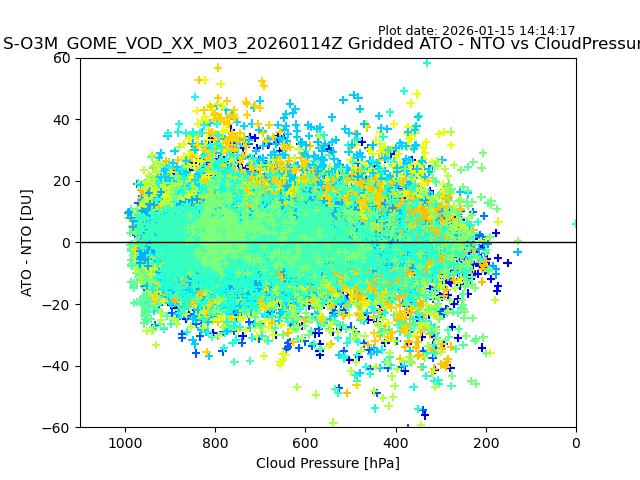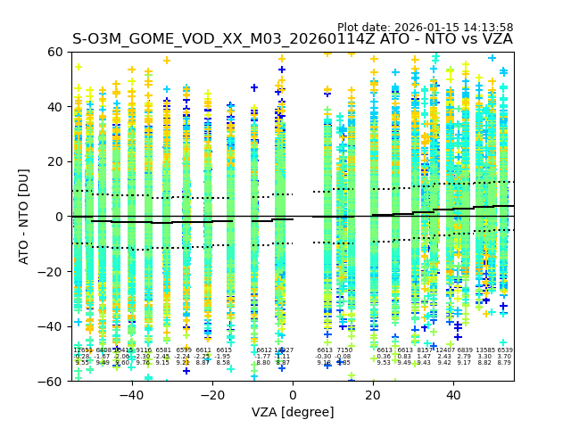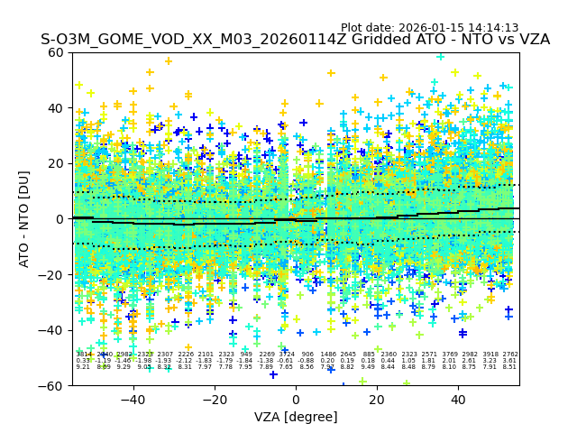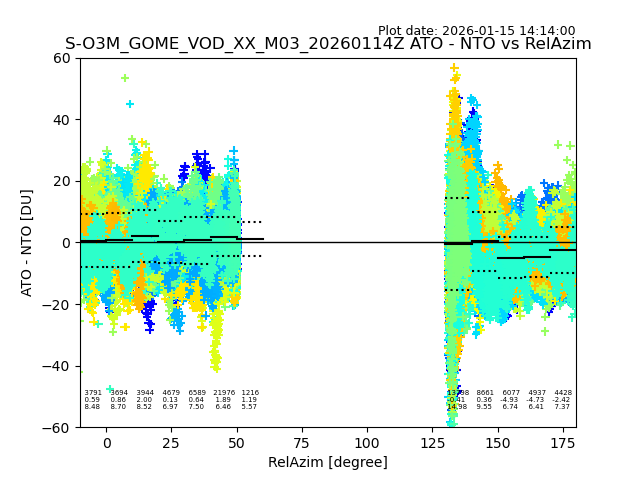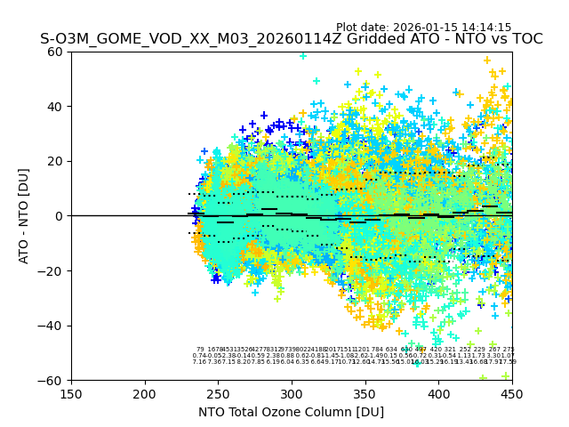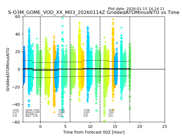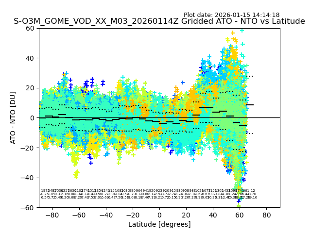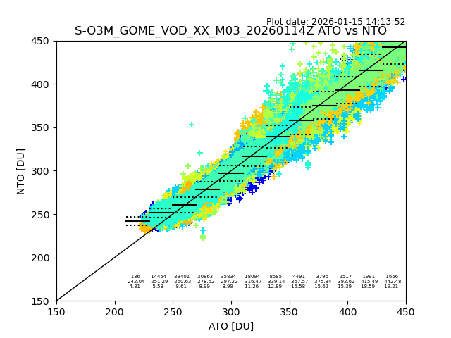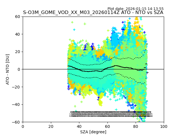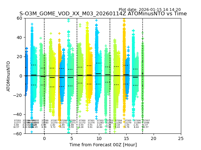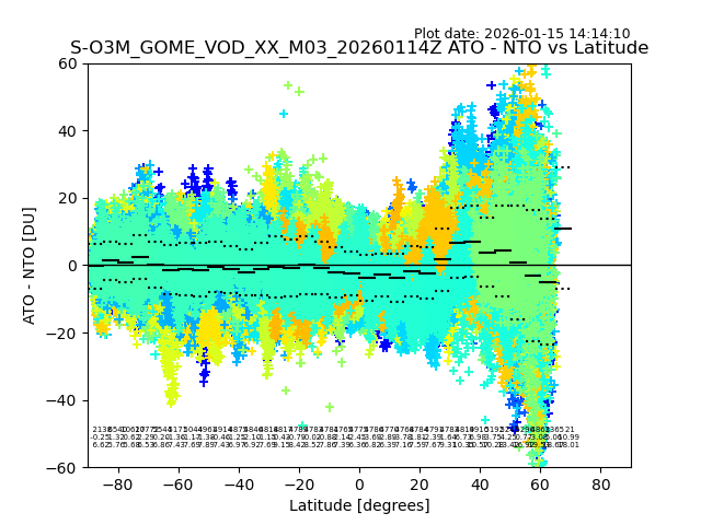 The date given in the title of the plot indicates the T=0 day for which the NTO/O3 data is compared. Example: S-O3M_GOME_VOD__M02_20110117Z indicates that the plot is for data from 2011-01-17 00:00 up NTO/O3 files starting at 2011-01-17 23:59 is used.